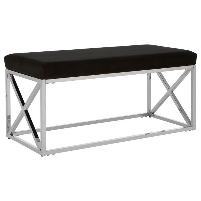 The Home Luxe Interior Allure Bench is a stylish and functional accent piece that combines sleek design with a tactile finish. The frame is crafted from smooth stainless steel with a rich, reflective silver finish. Its minimal lines are stylishly interrupted by geometric cross sections at each side. The thick cushioned seat, upholstered in soft black velvet, provides a plush and comfortable feel, making it a perfect addition to any luxe interior.
