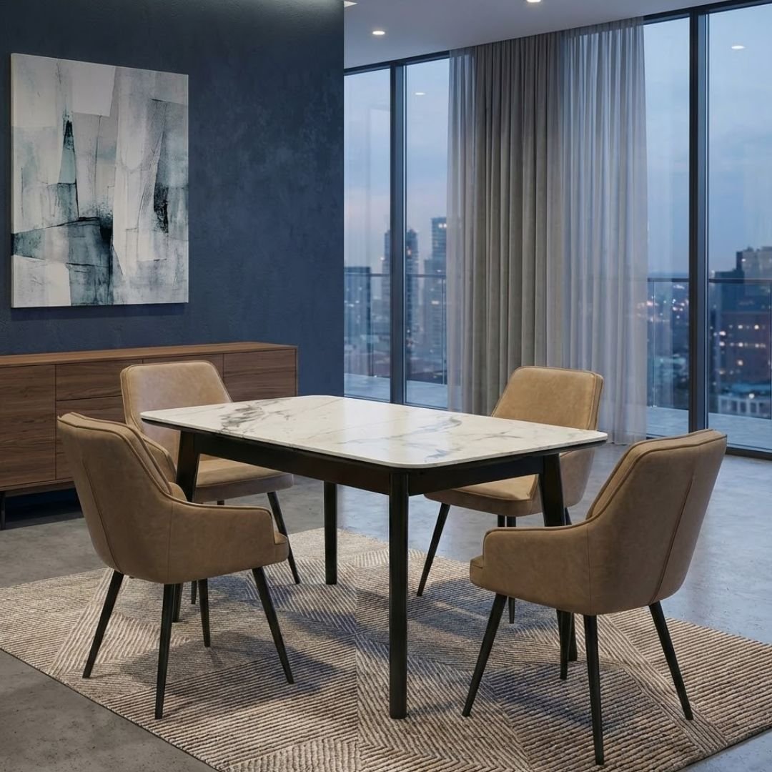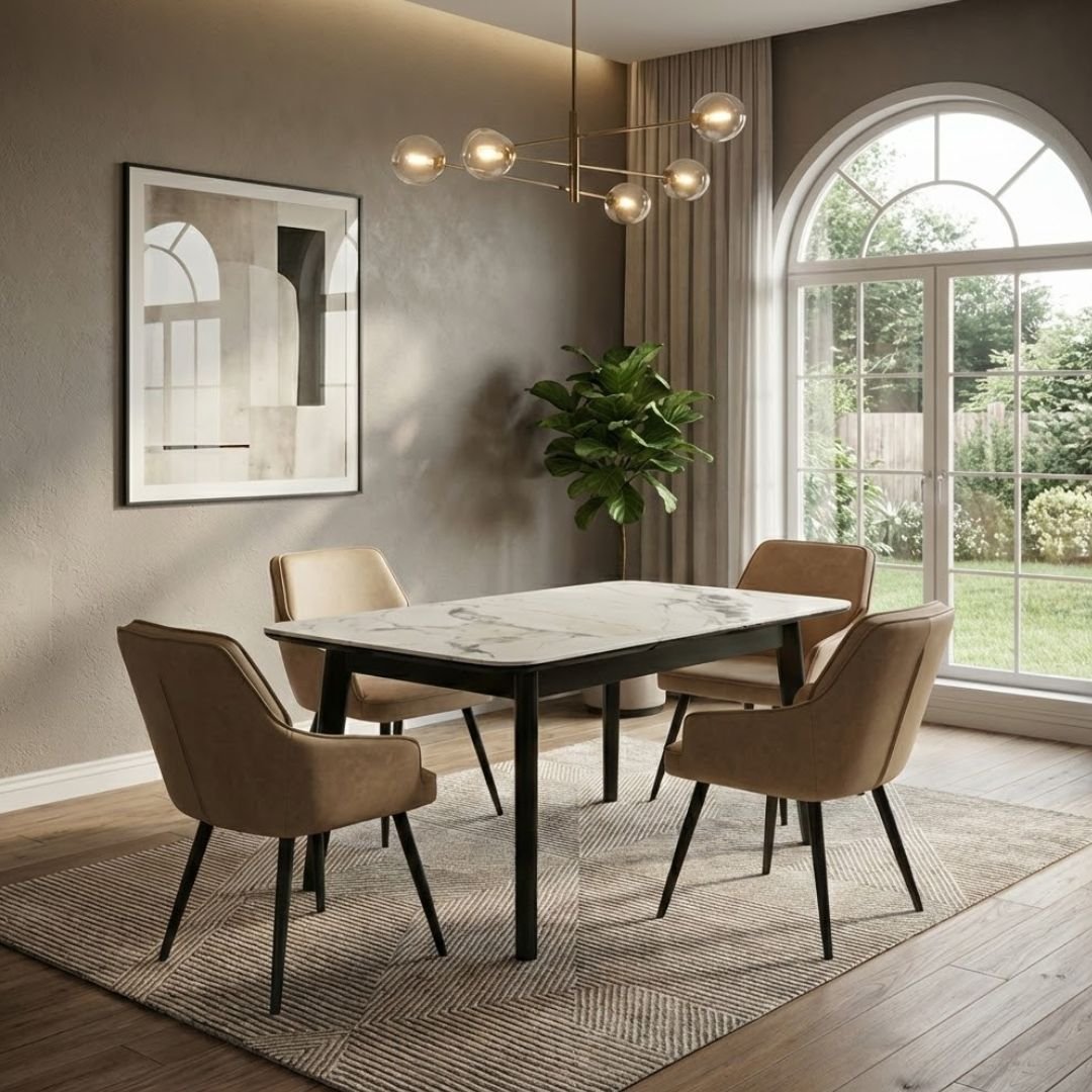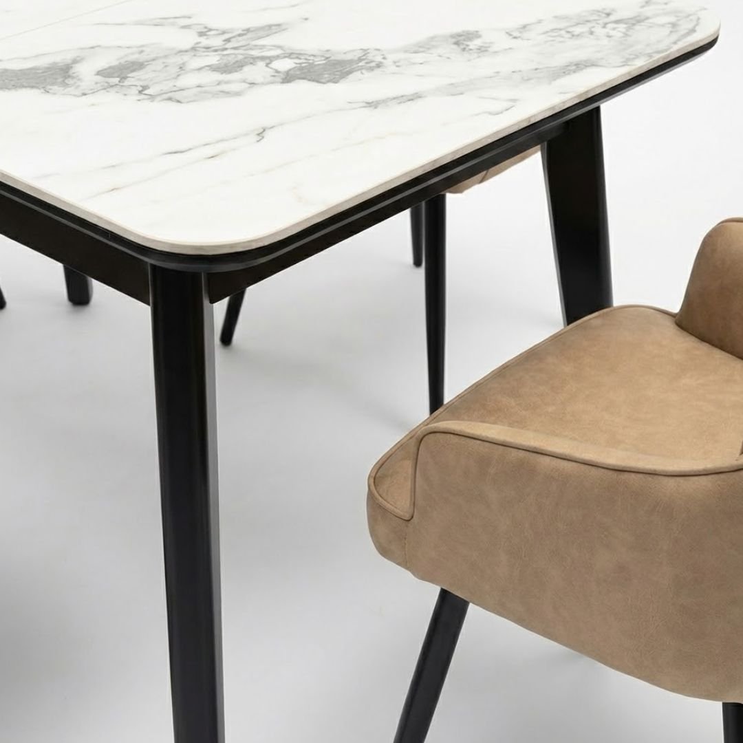 The centerpiece is the Arizona table, boasting a heat and scratch-resistant cream ceramic top infused with elegant gold veining. Designed for modern living, the table features an easy-to-use extension mechanism, taking your seating capacity from a compact 130cm to a spacious 160cm in seconds.