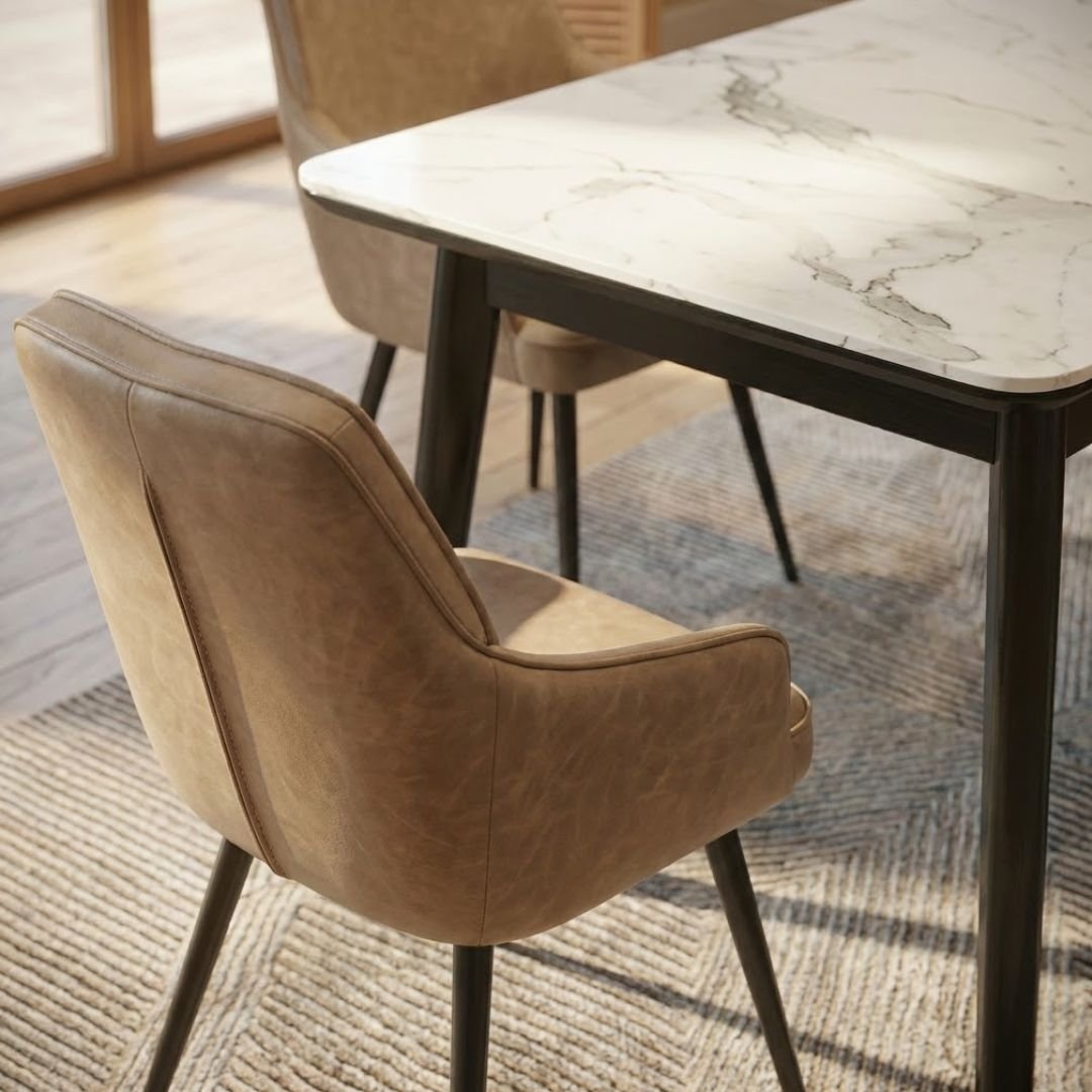 Transform your dining room with the stunning Arizona Extending Cream & Gold Ceramic Table and Palermo Beige Dining Chair set. Combining high-end aesthetics with everyday durability, this set features a luxurious marble-effect ceramic surface paired with the sleek, modern silhouette of PU leather seating.