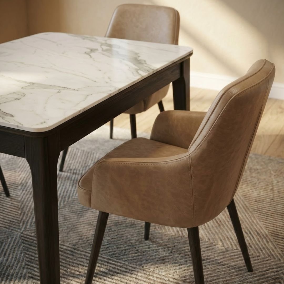 Accompanying the table are four Palermo Dining Chairs upholstered in a premium beige PU leather effect. These chairs offer a sophisticated look that is incredibly easy to wipe clean—ideal for busy households. The ergonomic design and integrated handle back provide both comfort and effortless style.