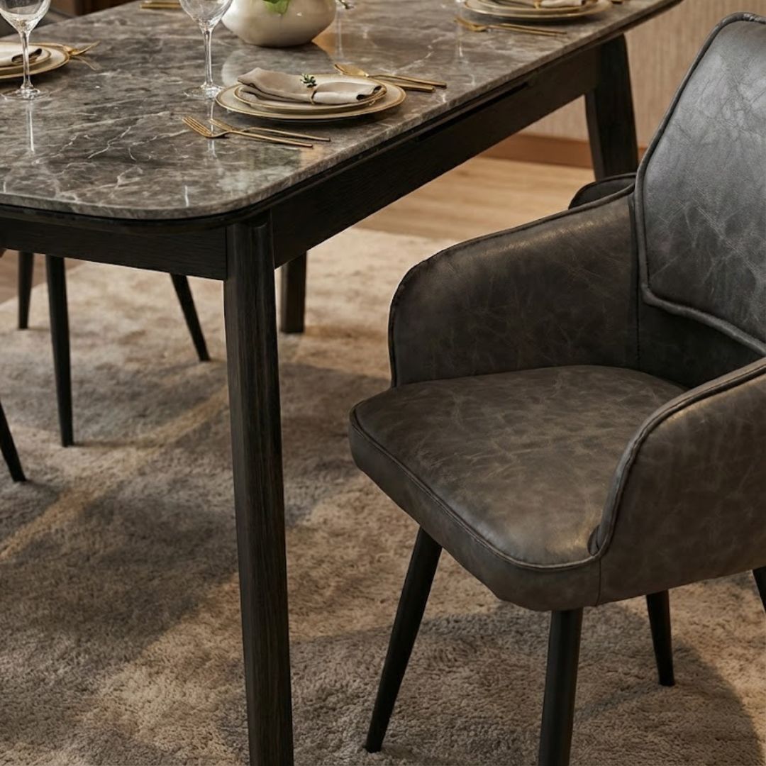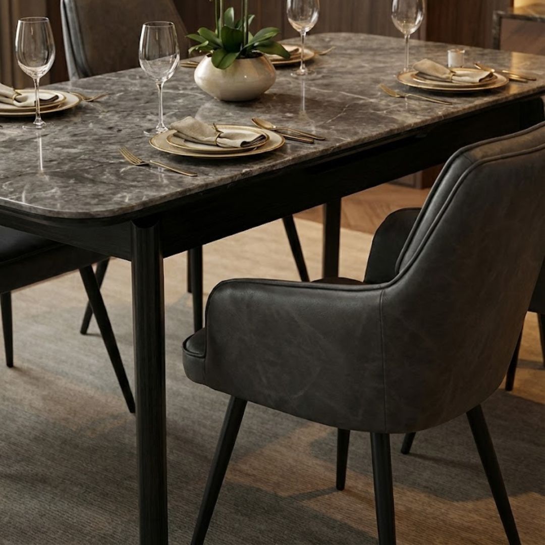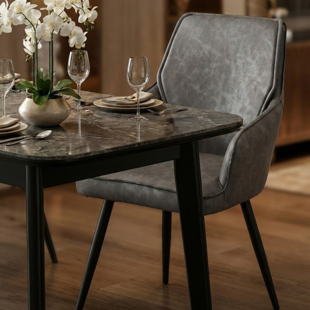 The set includes 4 Grey PU Leather Effect Dining Chairs. These armchairs offer the luxurious look of leather with the practical benefit of being easy to wipe clean. Designed with a supportive, curved backrest and sloping armrests, they sit on slender black metal legs that perfectly match the table's frame, creating a cohesive, industrial-chic aesthetic.