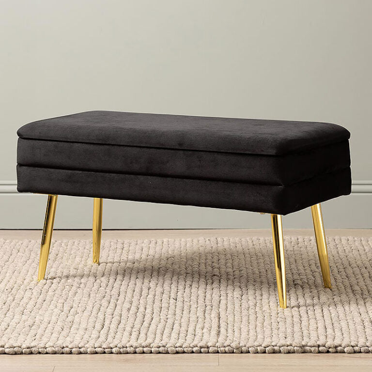 Elevate your home’s style and storage with the Black Velvet Storage Bench Ottoman With Gold Legs – exclusively from Home Luxe Interior.