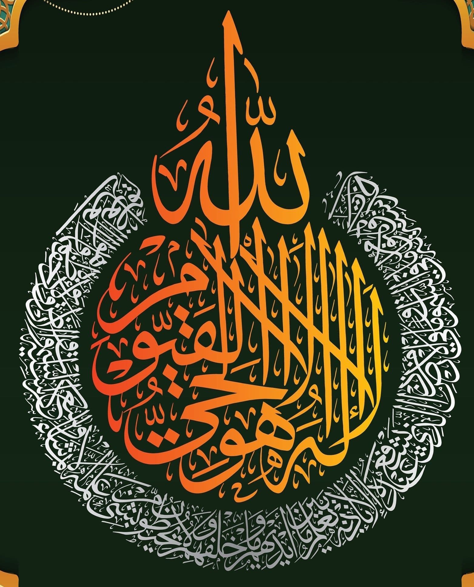 Elevate your home decor with our framed art print, "Arabic Art." This beautiful piece features intricate Islamic calligraphy in vibrant orange and gold tones, set against a rich, dark green background. The detailed script is framed by an ornate gold pattern, creating a truly majestic and spiritual work of art. This print is perfect for adding a touch of elegance and meaningful symbolism to any room.