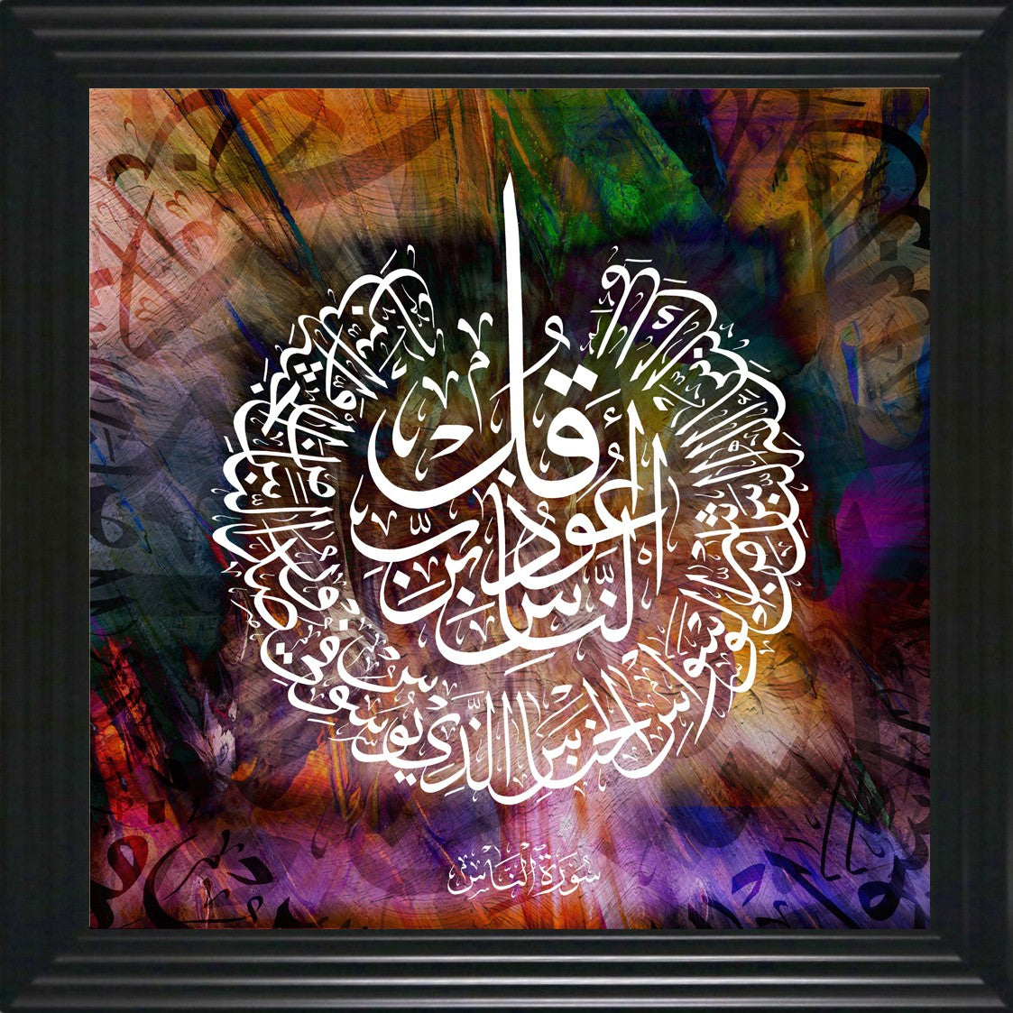 Elevate your space with this stunning Arabic Calligraphy Art from Home Luxe Interior. This piece features the complete Surah An-Nas in elegant white script, set against a dynamic multi-colored background. The artwork is beautifully framed in a sleek black frame and weighs approximately 3kg.