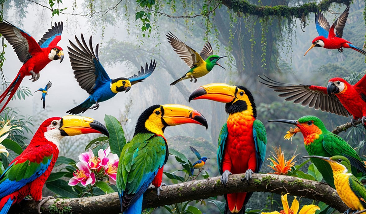 Vibrant Tropical Scene: Captures the energy and beauty of a rainforest with detailed depictions of toucans, macaws, and other exotic birds.