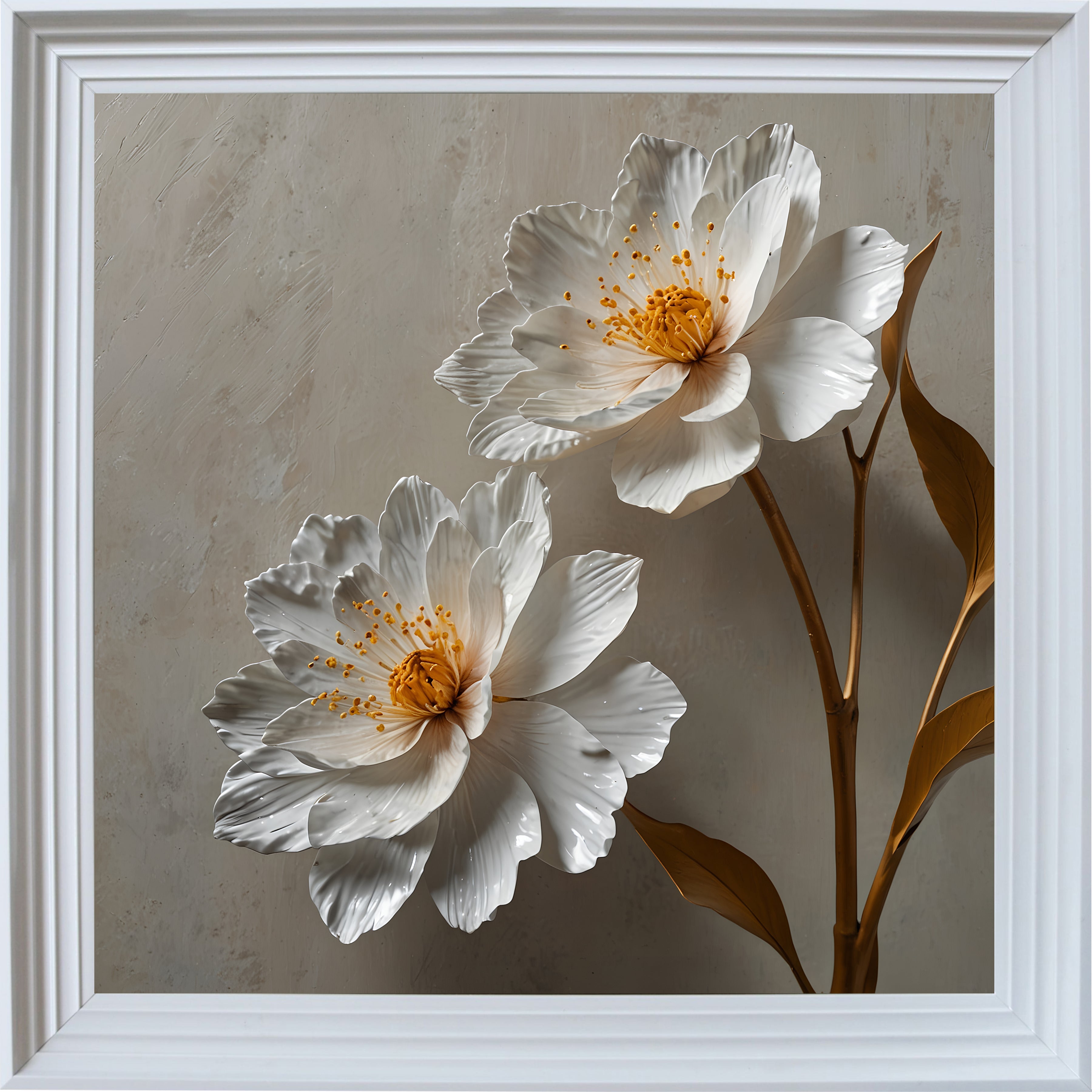 Introduce a sense of serene elegance to your home with our framed art print, "Delicate florals shimmer with tranquil grace." This beautiful artwork features two large, exquisite white flowers with subtle golden yellow centers, set against a soft, textured beige background. The composition is simple yet sophisticated, creating a peaceful and graceful focal point that will add a touch of natural beauty to any room.