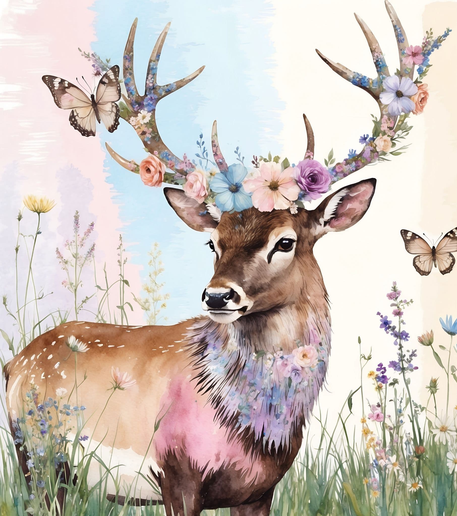 Color: Soft pastel pinks, blues, and yellows, with rich browns of the stag and vibrant wildflower accents.