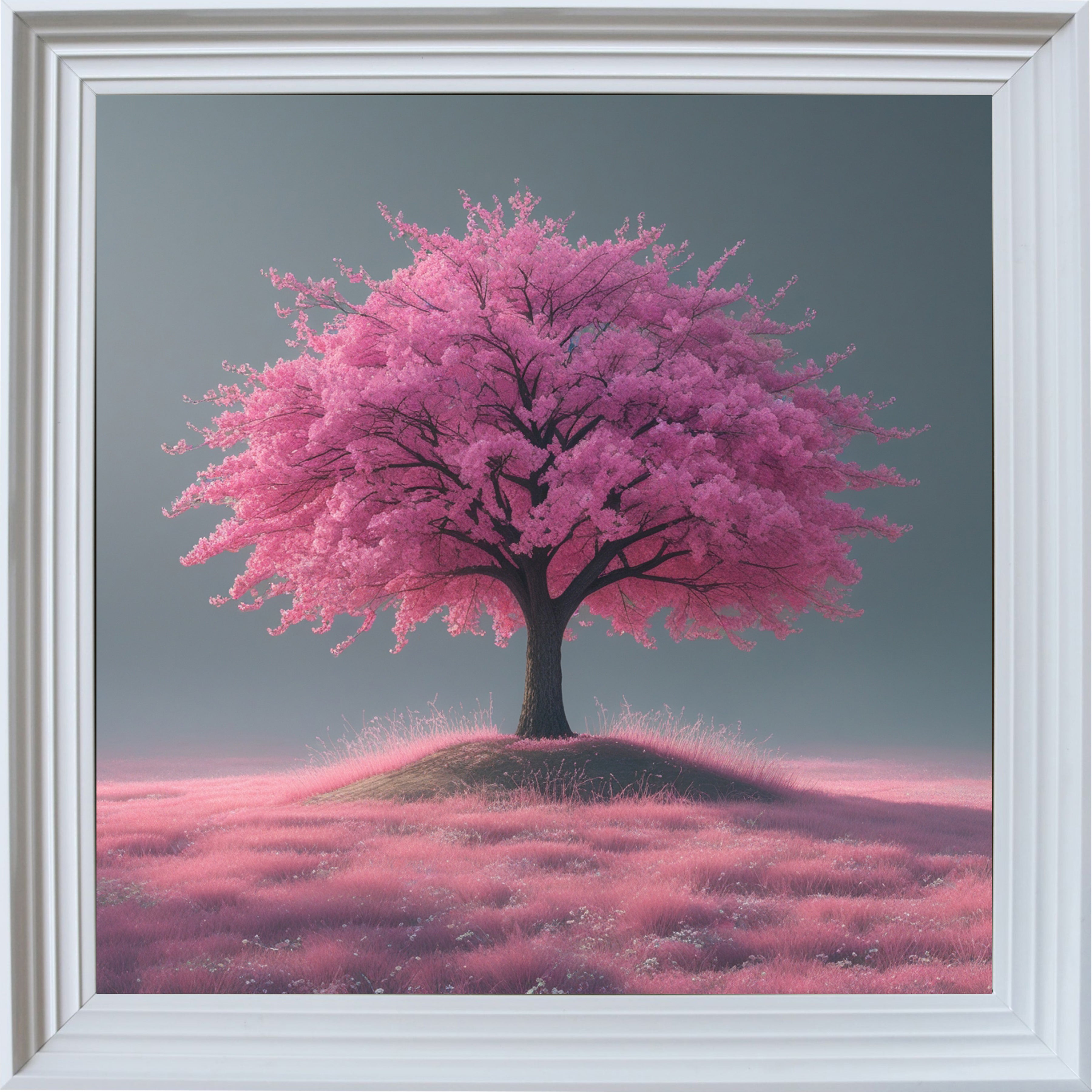 Enchanting & Serene Landscape: A beautifully simple yet impactful image of a lone pink tree, symbolizing hope, beauty, and renewal.