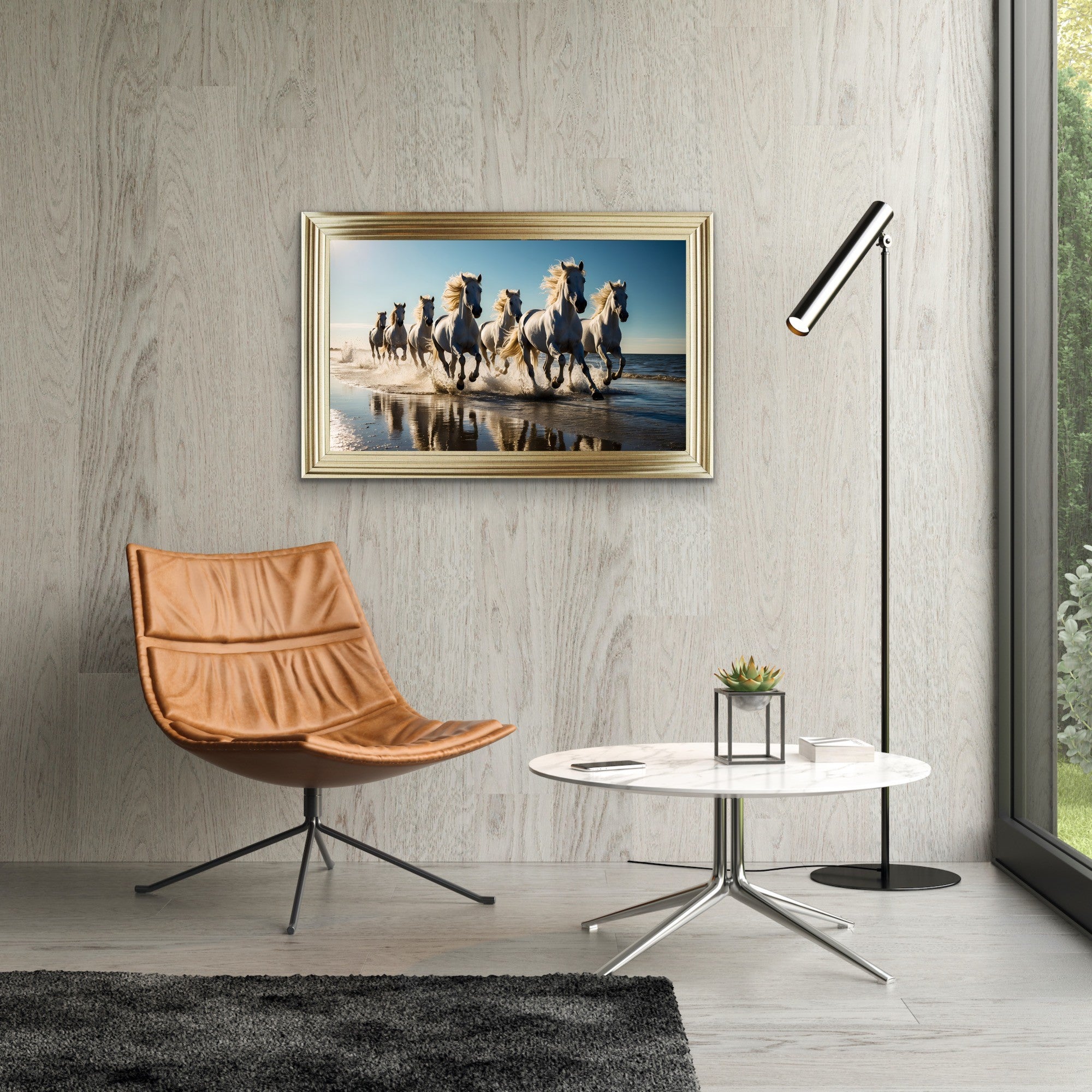 Capture the powerful grace and untamed spirit of the wild with our breathtaking framed art print, "Seven white horses galloping." This stunning image features a herd of magnificent white horses thundering through the shallow waters, creating dynamic splashes against a bright sunlit backdrop. The sense of motion, freedom, and raw beauty makes this a captivating focal point for any room.