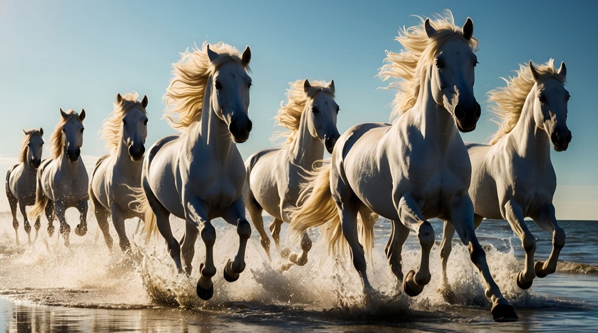 Color: Bright whites and blues of the horses and sky, with sunlit reflections in the water.