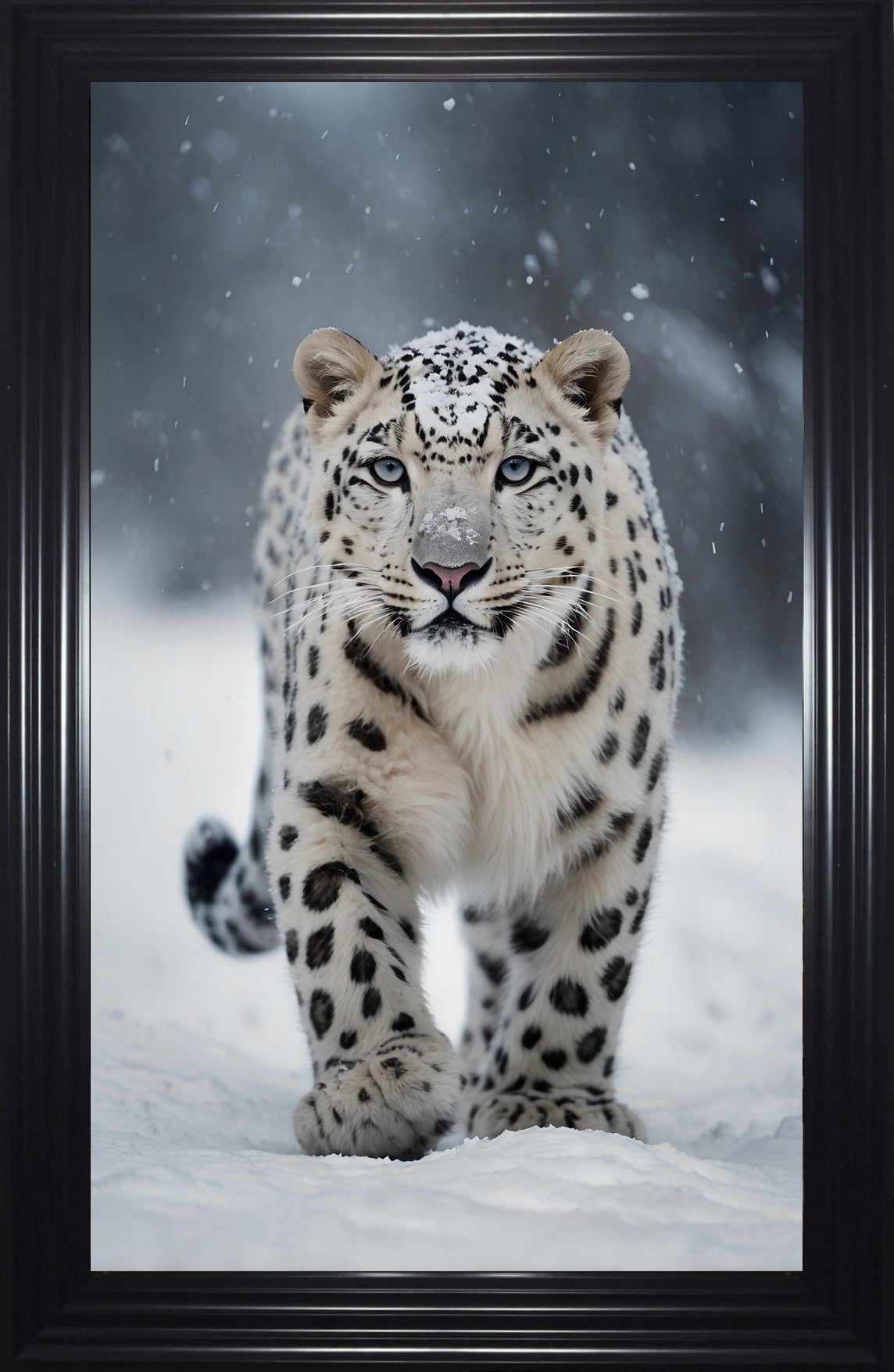 Bring the majestic beauty of the snowy wilderness into your home with our framed art print, "Snow Leopard with piercing eyes." This captivating piece features a stunning portrait of a snow leopard, its striking white and grey fur patterned with distinctive black spots. The leopard's intense, piercing blue eyes gaze directly forward, creating a powerful and mesmerizing focal point. The snowy background enhances the creature's ethereal beauty and the wild, untamed spirit it embodies.