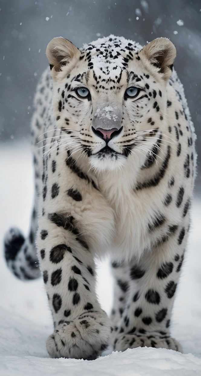 Snowy Wilderness Setting: The soft, snowy background enhances the leopard's camouflage and the serene yet wild atmosphere.