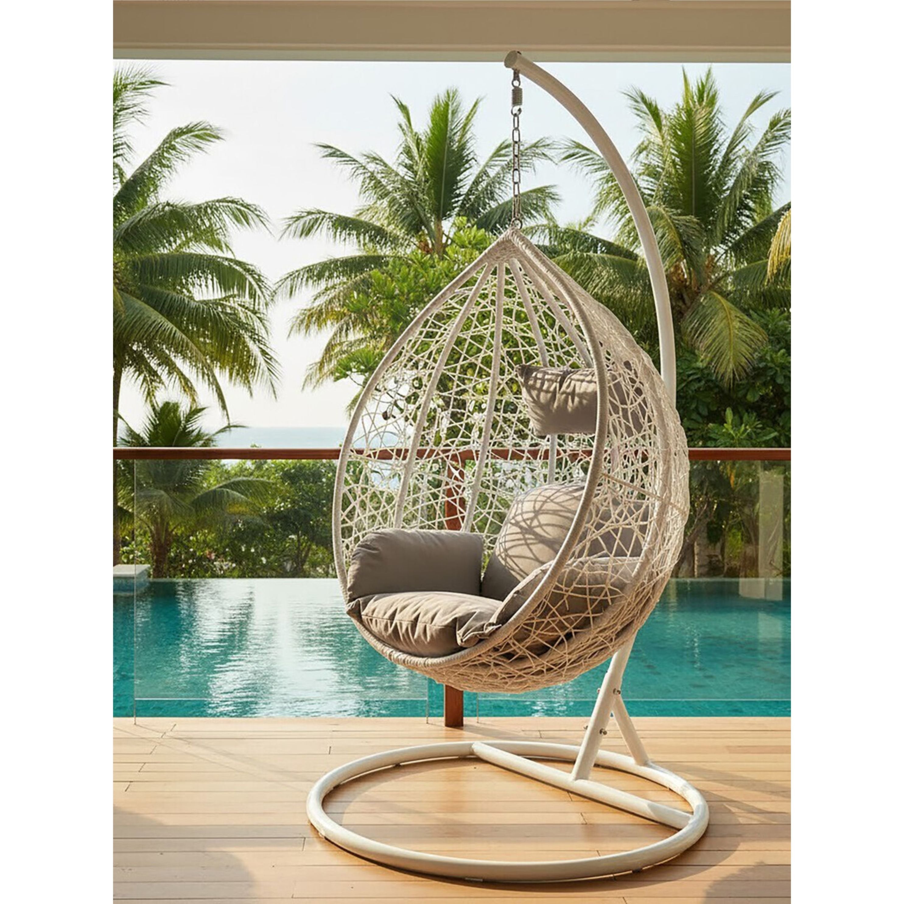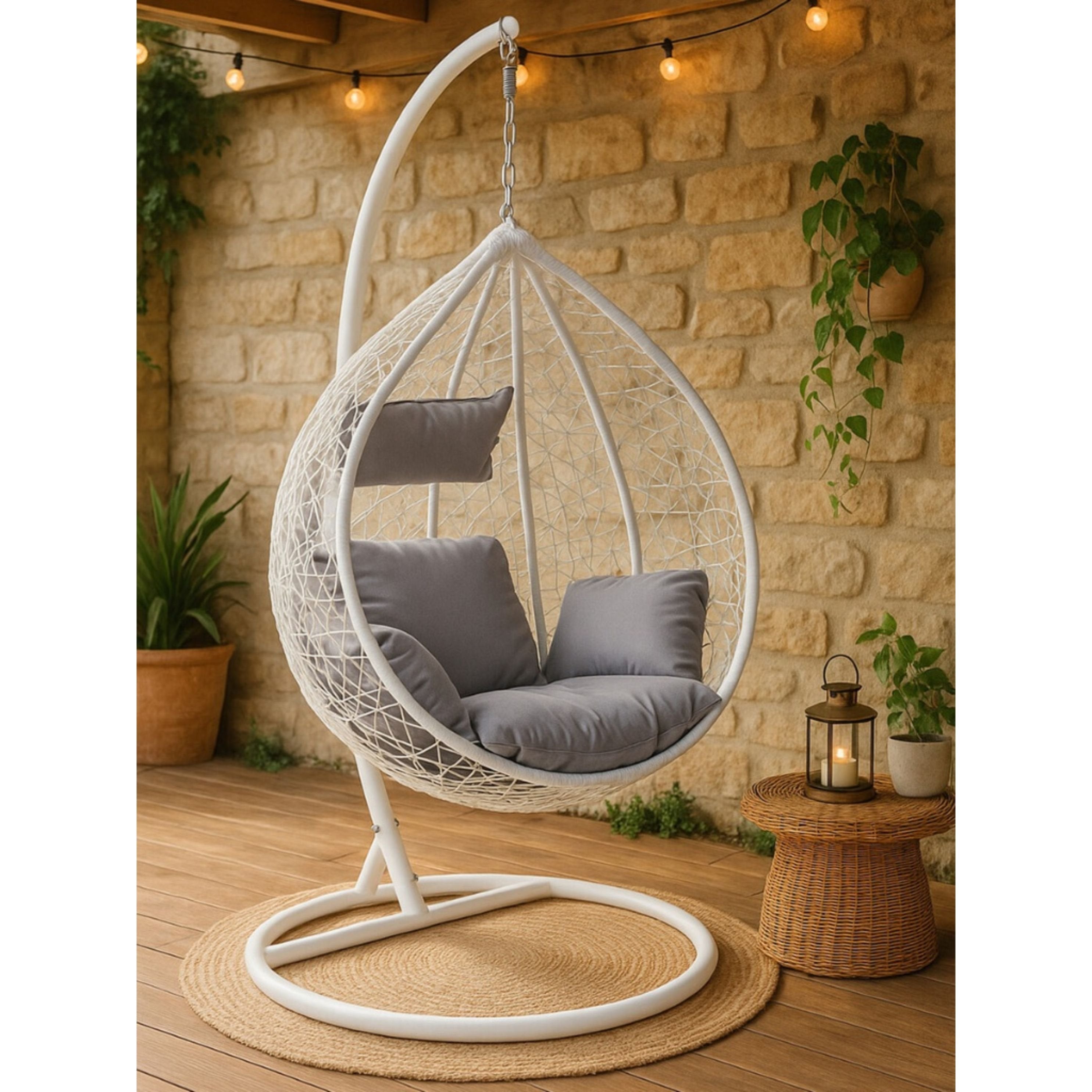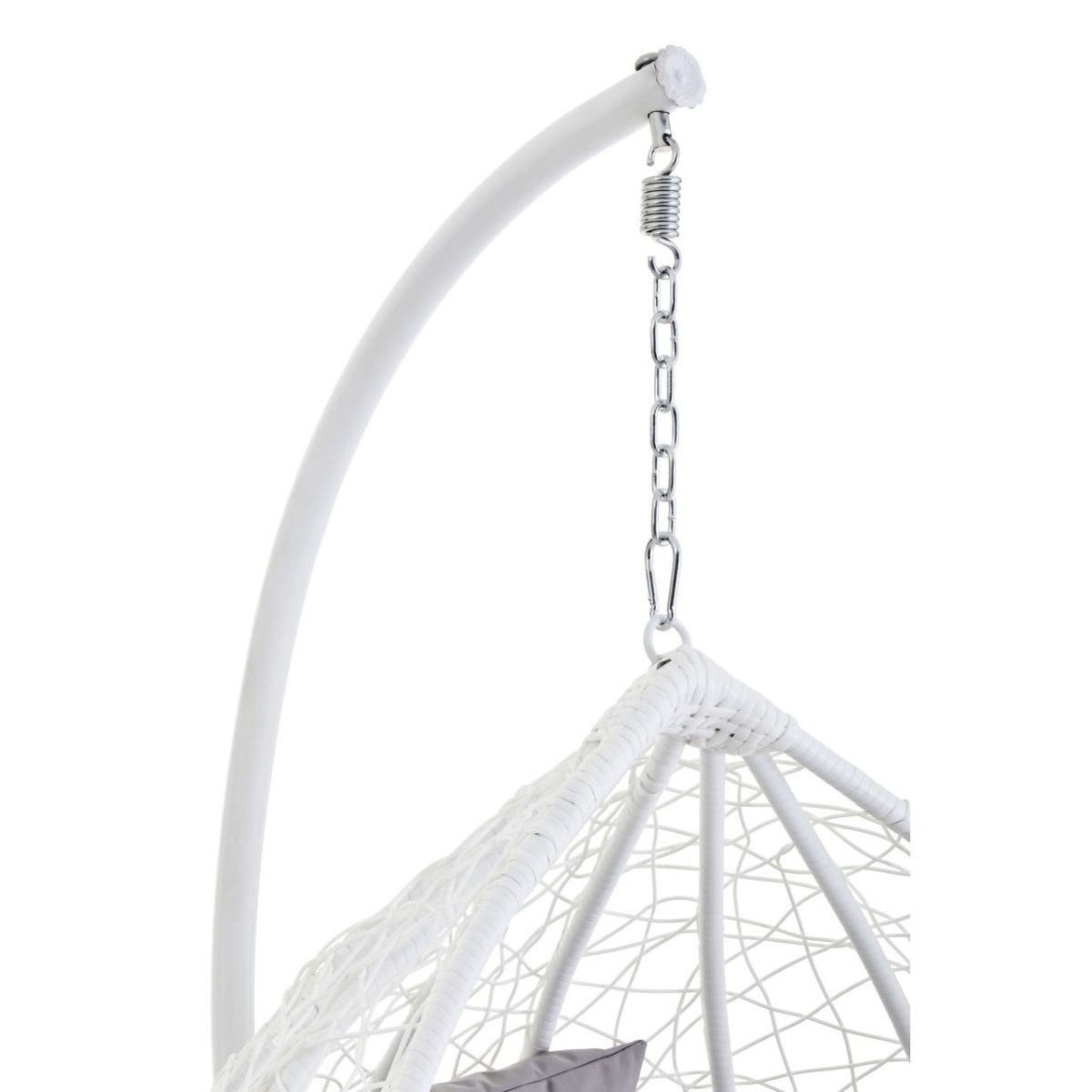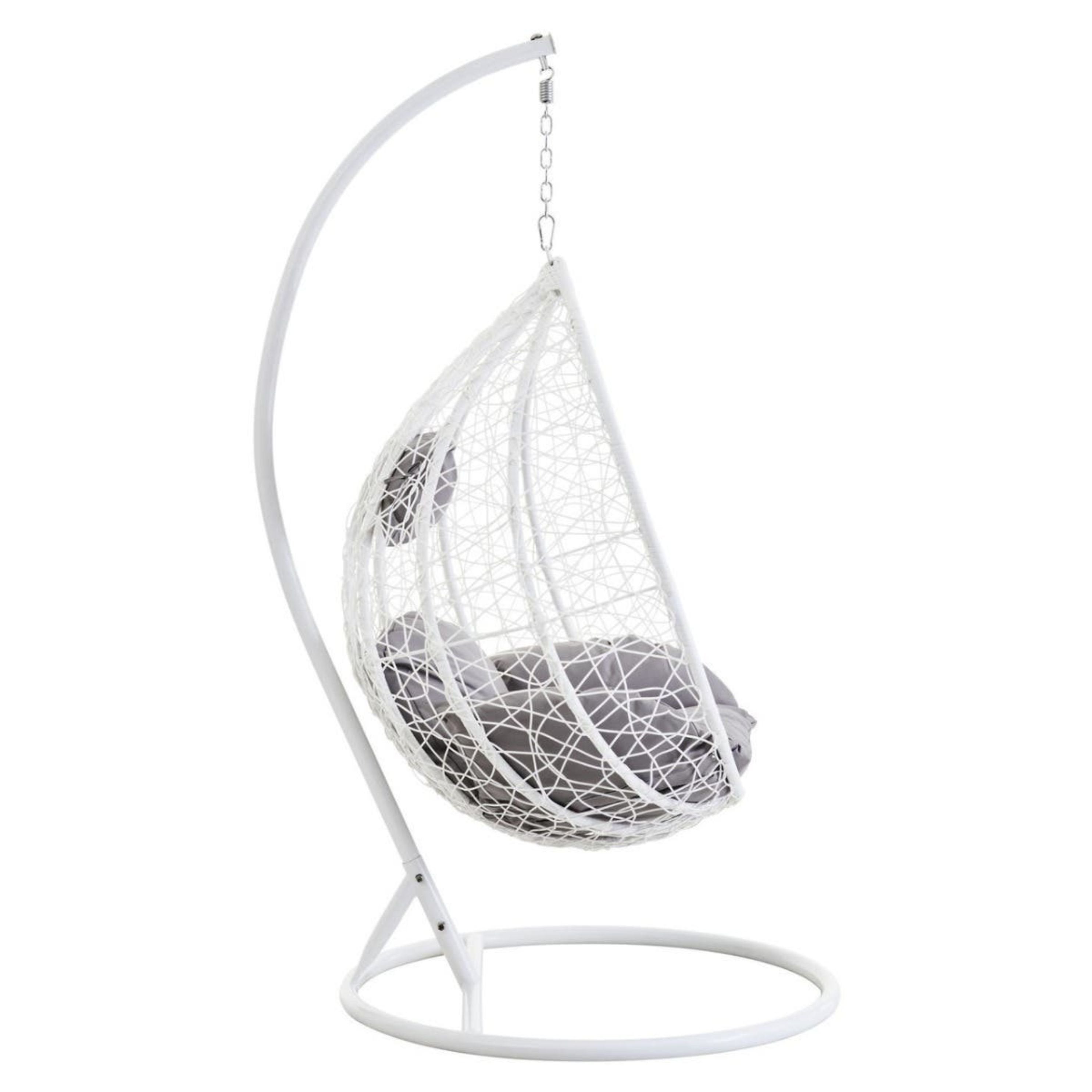 Designed for relaxation, the chair includes plush grey cushions filled with soft foam for superior comfort. It hangs securely from a sleek white metal frame with a stable round base, creating a seamless monochrome look with a pop of contrasting grey. Weather-resistant and durable, it is perfect for a sunny patio corner, a conservatory, or a modern living room reading nook.