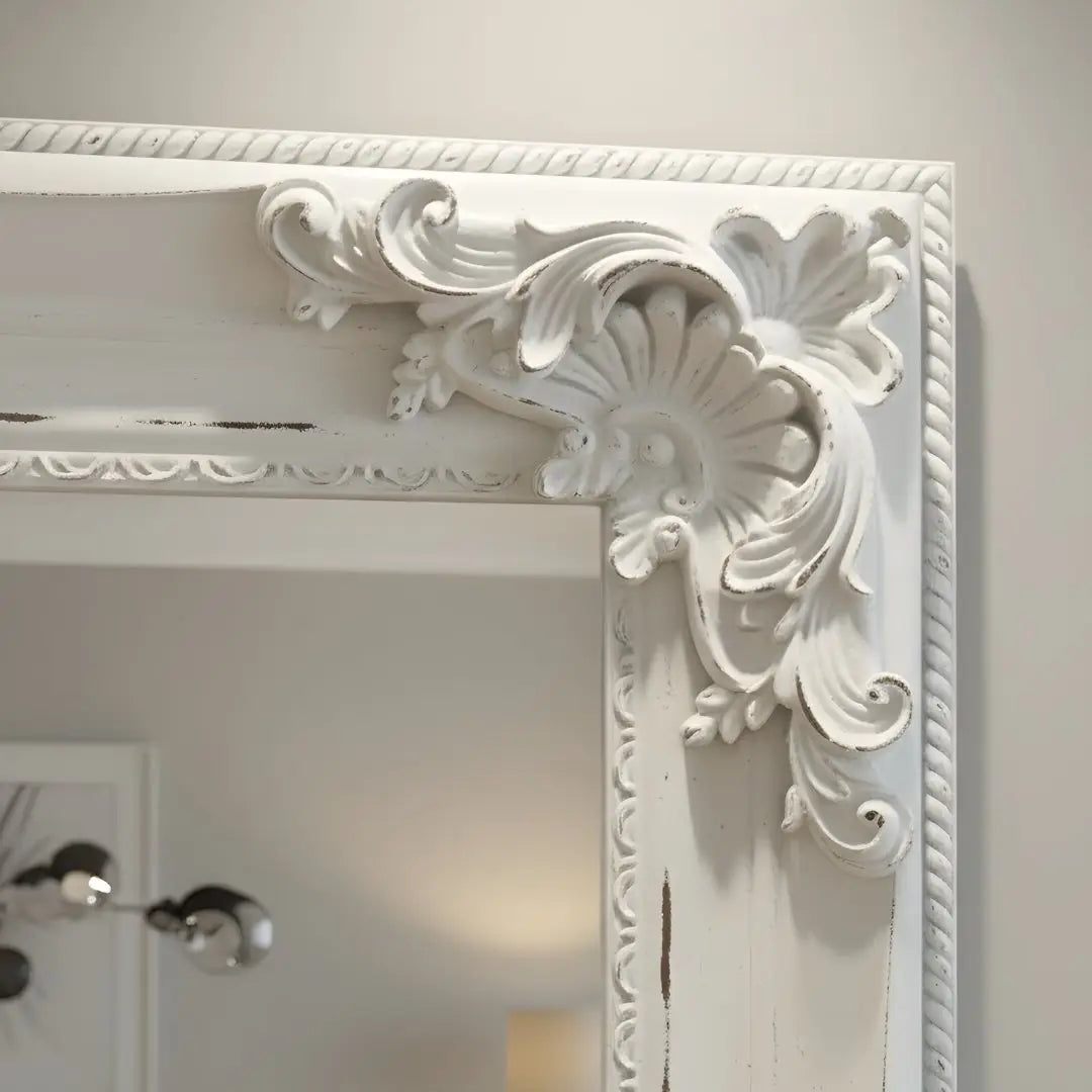 Make a grand statement with the Juliette Large Mirror Frame, a stunning full-length piece that blends vintage charm with modern practicality. Standing at an impressive 180cm tall, this mirror features a thick, handcrafted-style frame adorned with intricate ornate carvings at the corners and edges, finished in a classic matte white.
