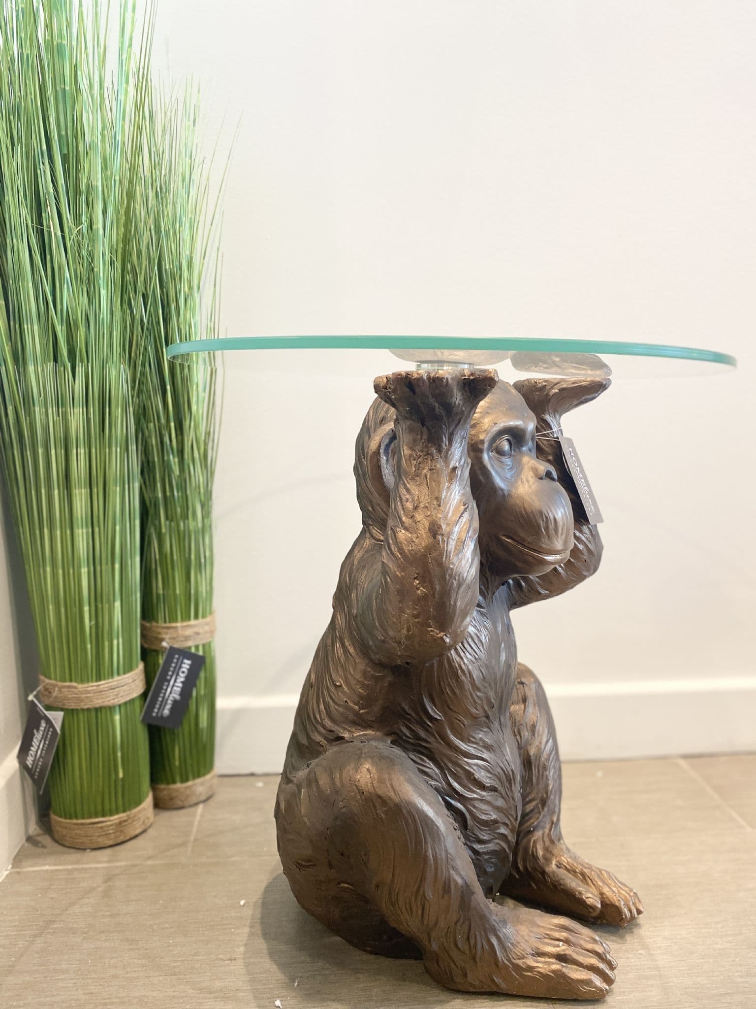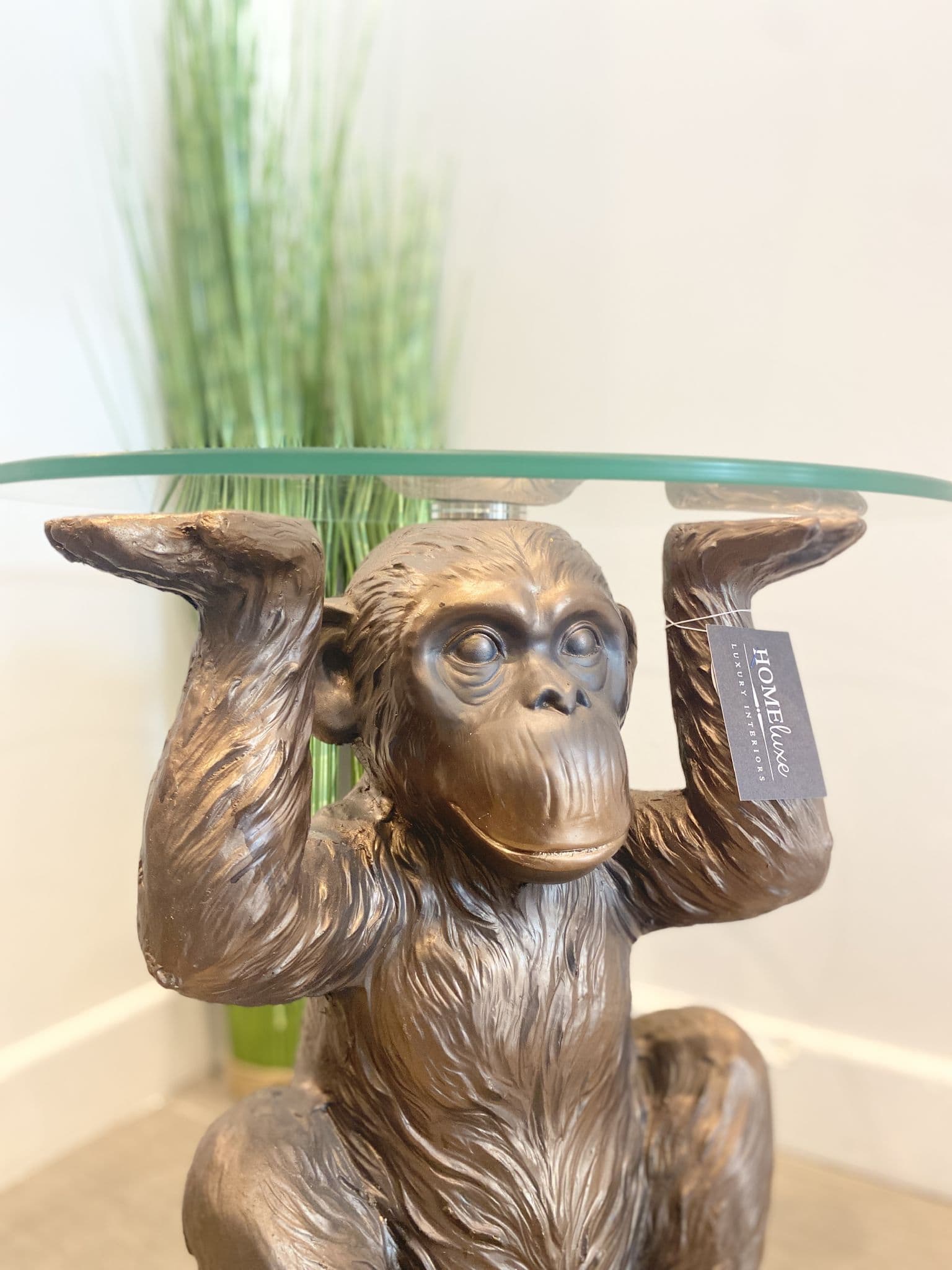 Make a statement with this loud, Chimpanzee side table decor. Embodying a full 3D structure and glorified with realistic detailing in a sharp bronze tone to accentuate an already vibrant piece. Complement any household items on this unique and wild table
