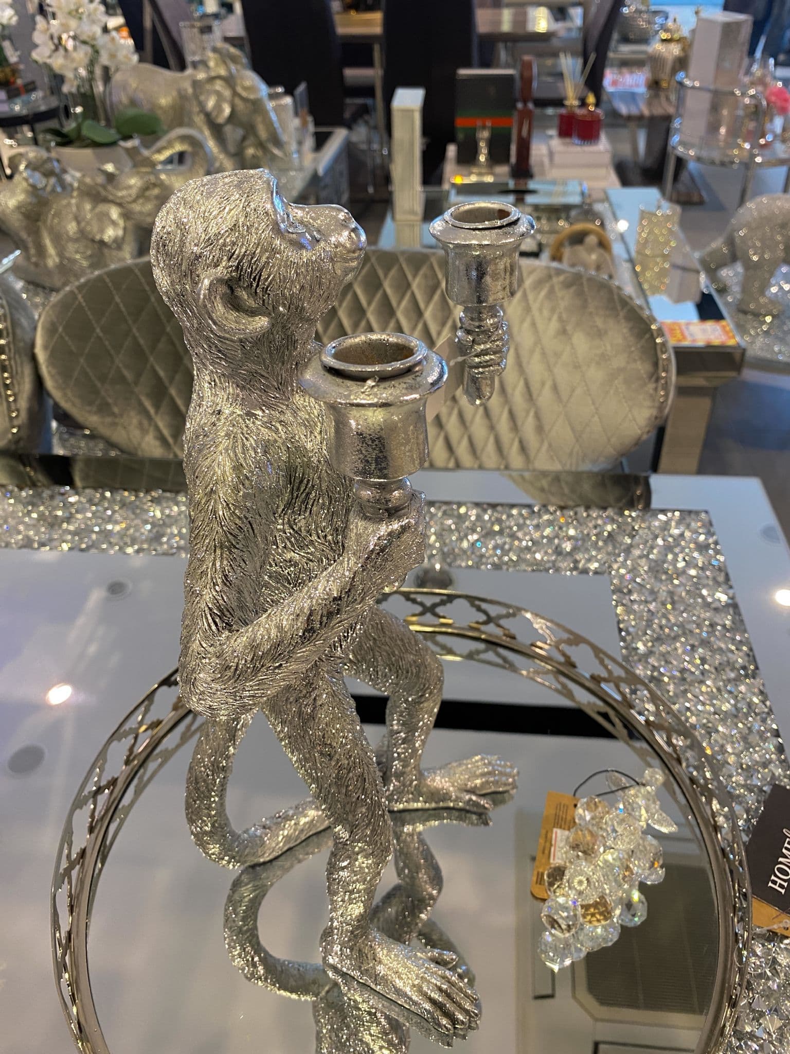 Novelty Design decor, this Silver Standing Monkey Candelabra is the perfect home decor. Beautifully designed with realistic detailing for an enhanced effect. Built to complement and to be perfectly situated on any surface in the home. Perfect for the modern, contemporary or traditionally styled interiors