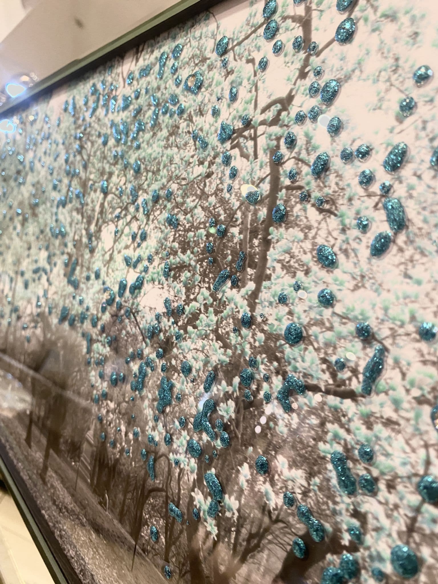 This picture features a 'Aqua Blossom Tree' that exhibits a rich design with glitter details around the picture, creating a smart look for your home. Finished with a chrome step frame.