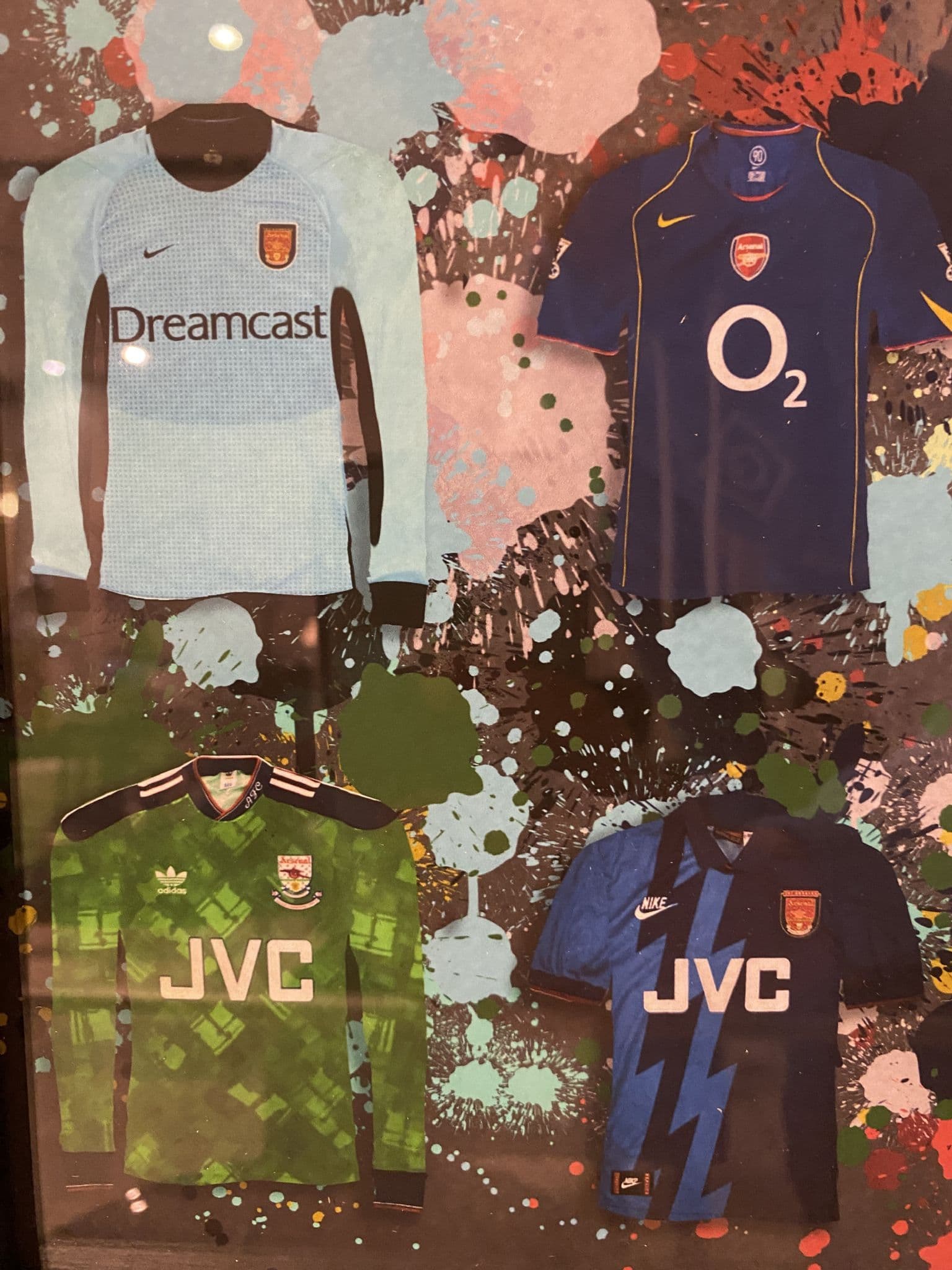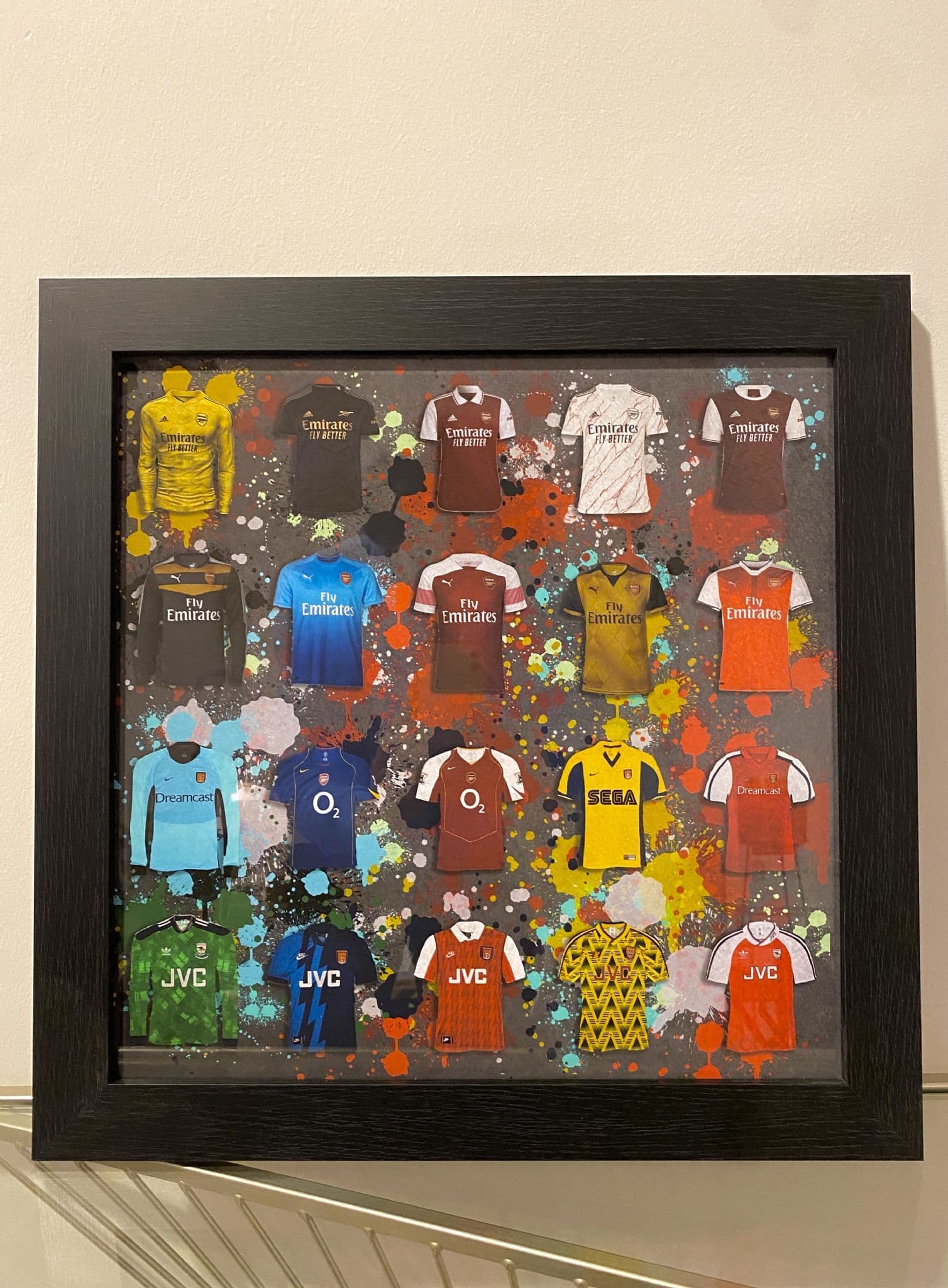 This picture features 'Arsenal Football Football Strip Collection', exhibiting a rich design with liquid details around the picture, creating a smart look for your home. Finished with a black frame.