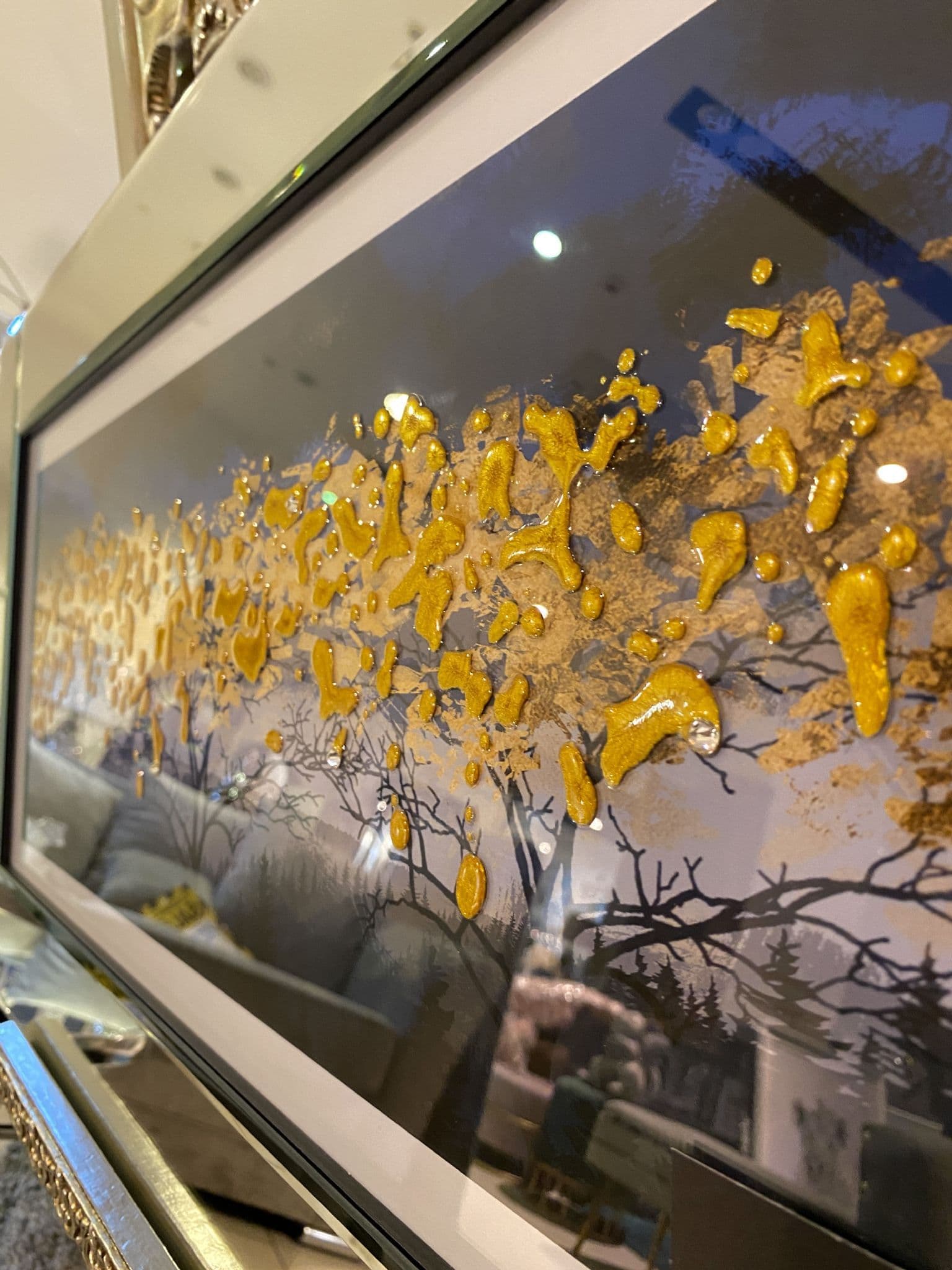 This picture features a 'Painted Autumn Trees' that exhibits a rich design with glitter details around the picture, creating a smart look for your home. Finished with a mirror frame.