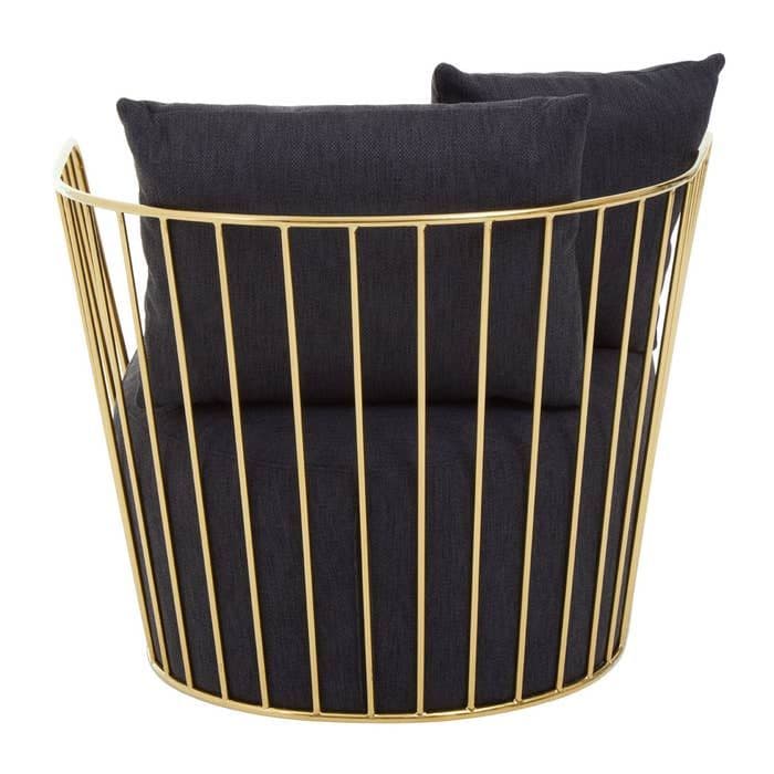 Enhance your living space with the Azalea Black Fabric and Metal Chair, a perfect fusion of art deco glamour and modern comfort. Featuring a striking gold-finish stainless steel frame and plush black fabric upholstery, this chair is designed to make a bold statement. The foam-padded seat, paired with two cozy cushions, provides luxurious comfort, while the angular profile adds a sophisticated edge to your décor.