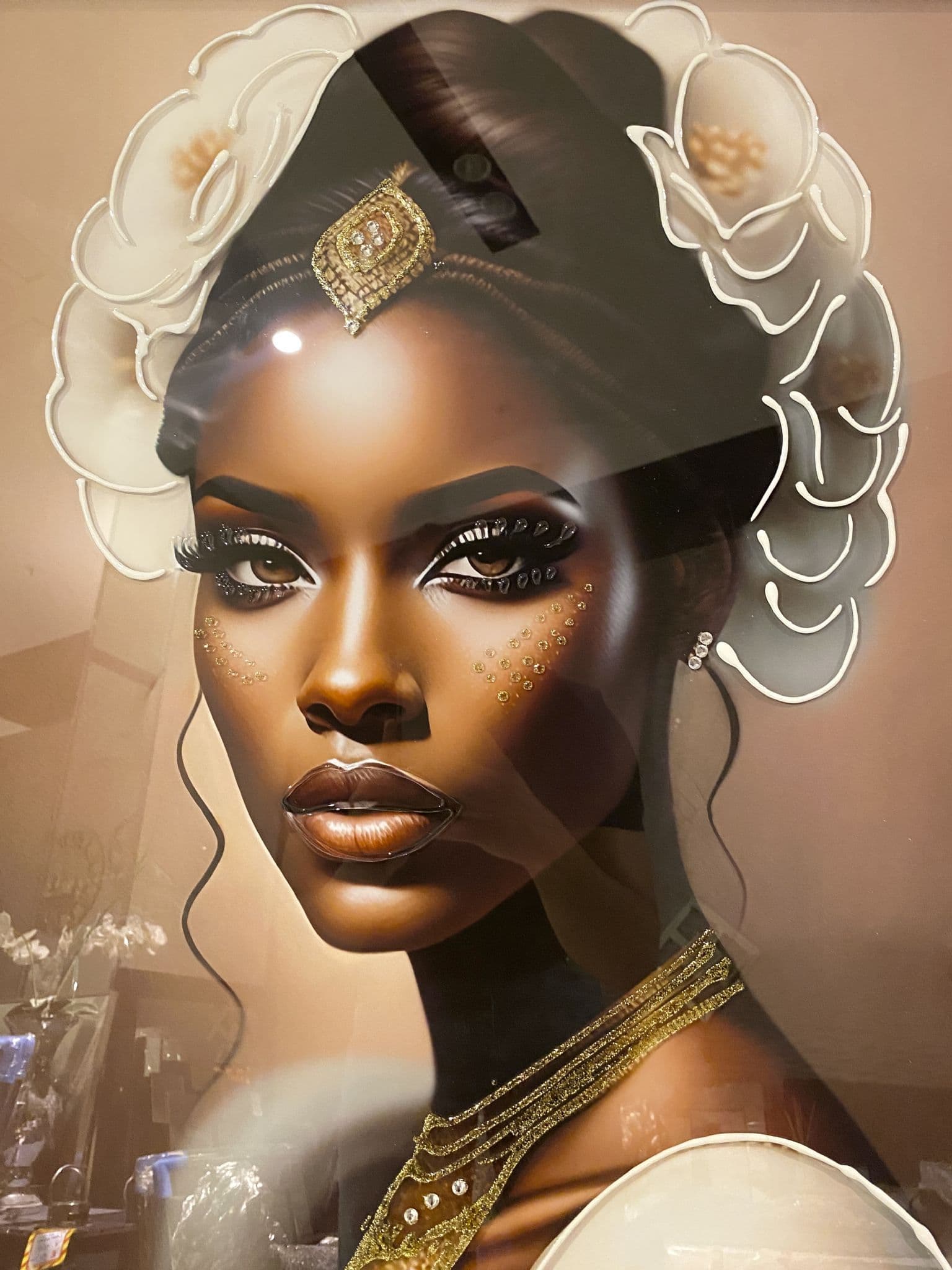 This picture features 'African Lady Design', exhibiting a rich design with liquid details around the picture, creating a smart look for your home. Finished with a Mirror Frame.