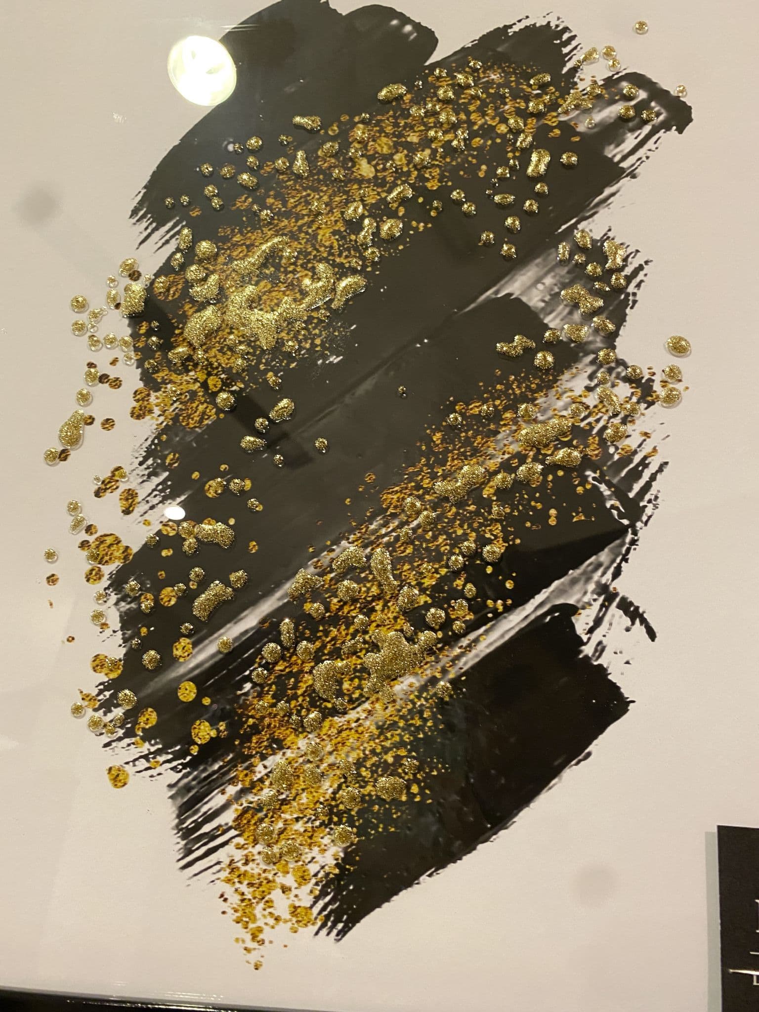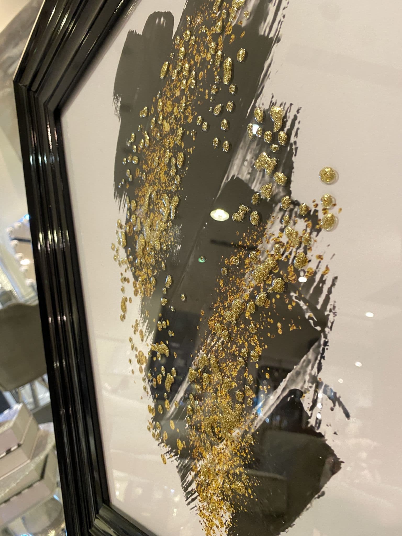 This picture features a 'Black & Gold Abstract Art' that exhibits a rich design with glitter details around the picture, creating a smart look for your home. Finished with a black step frame.