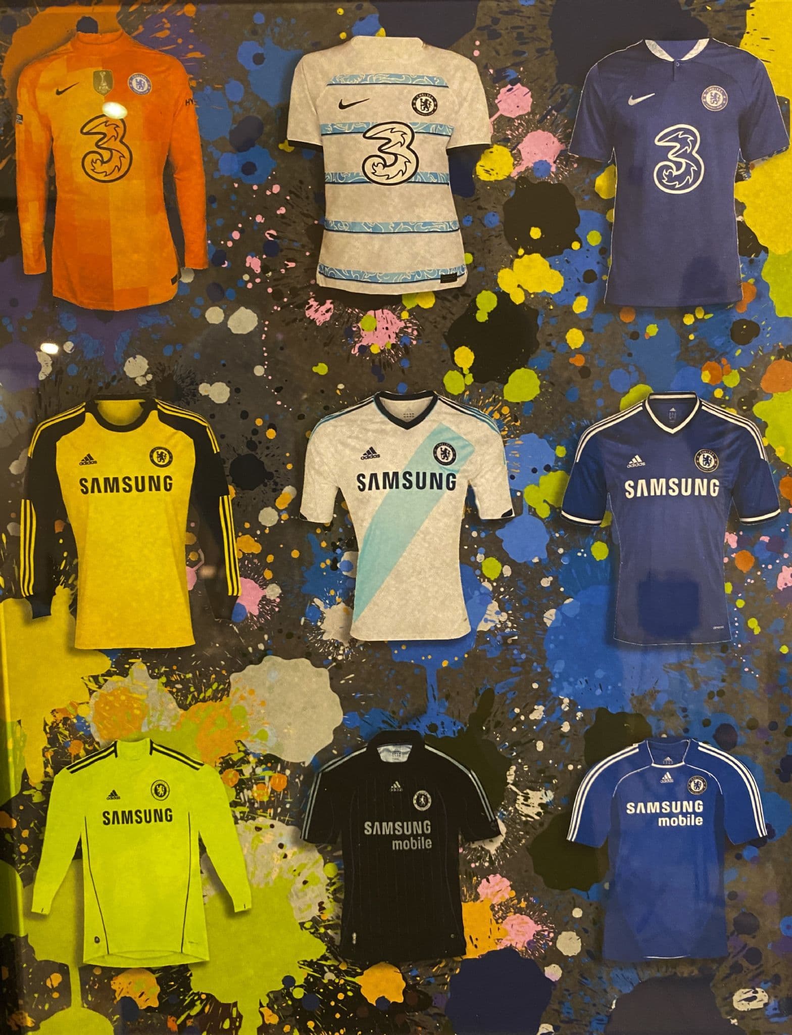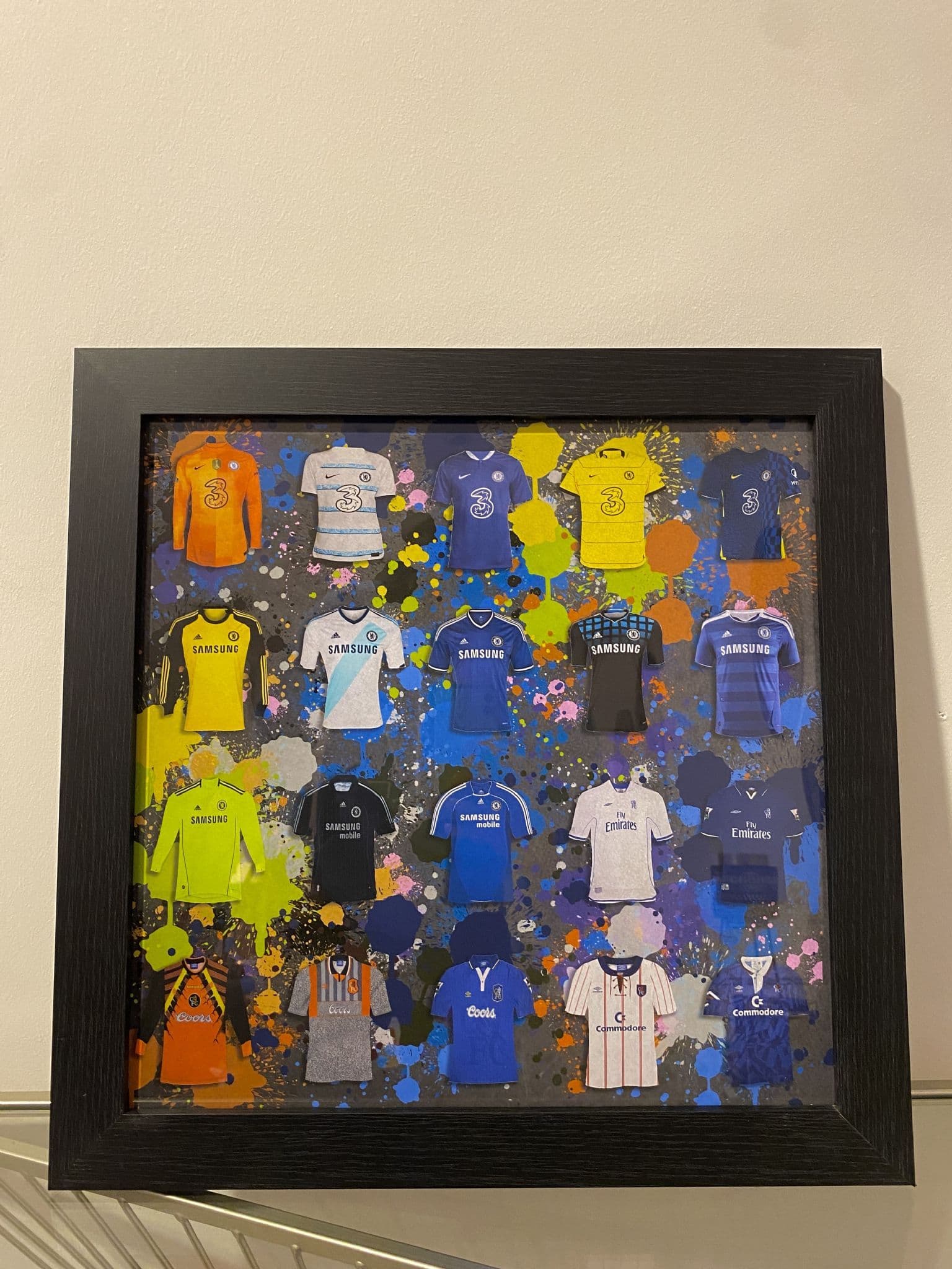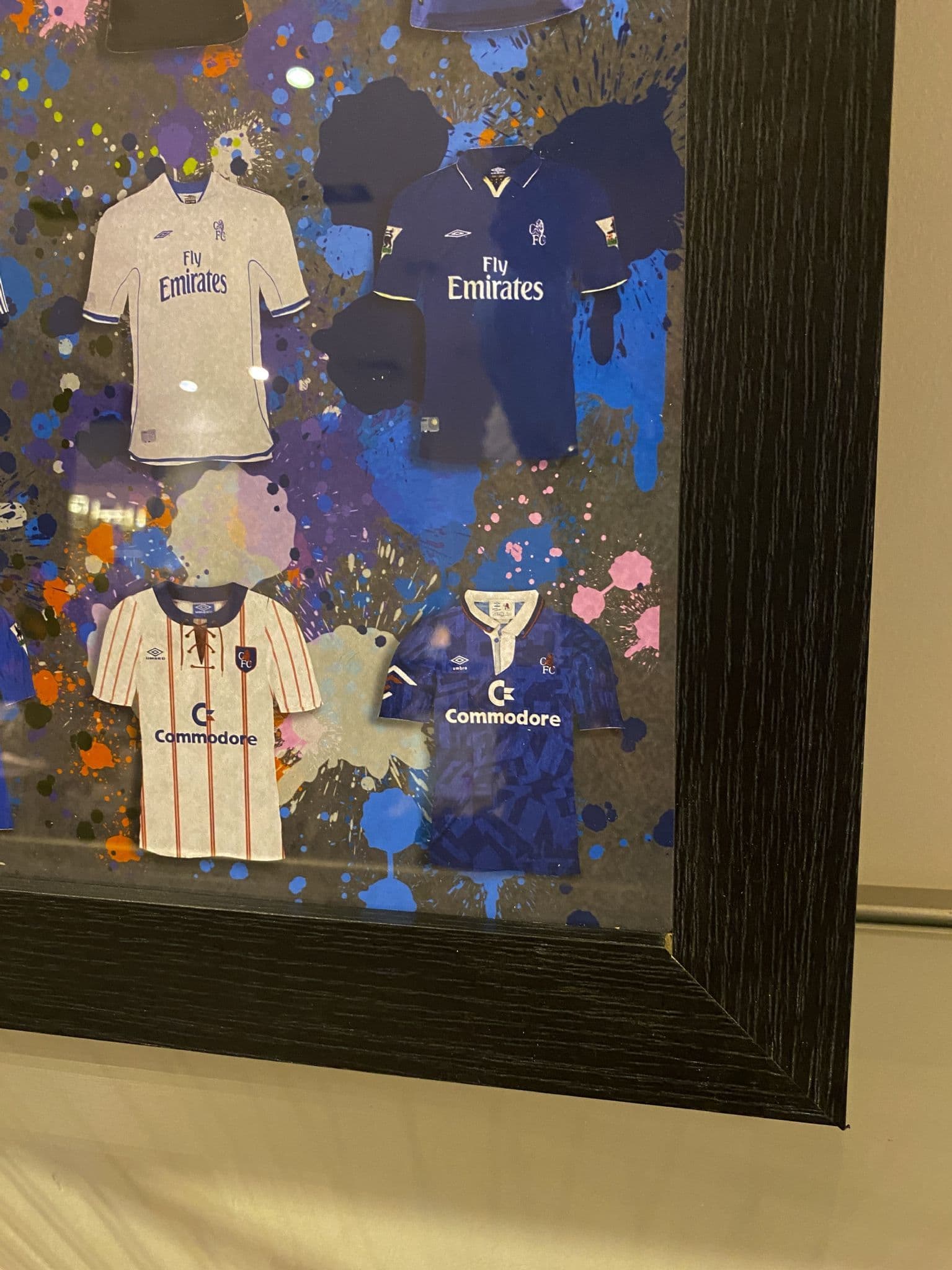 This picture features 'Chelsea Football Football Strip Collection', exhibiting a rich design with liquid details around the picture, creating a smart look for your home. Finished with a black frame.