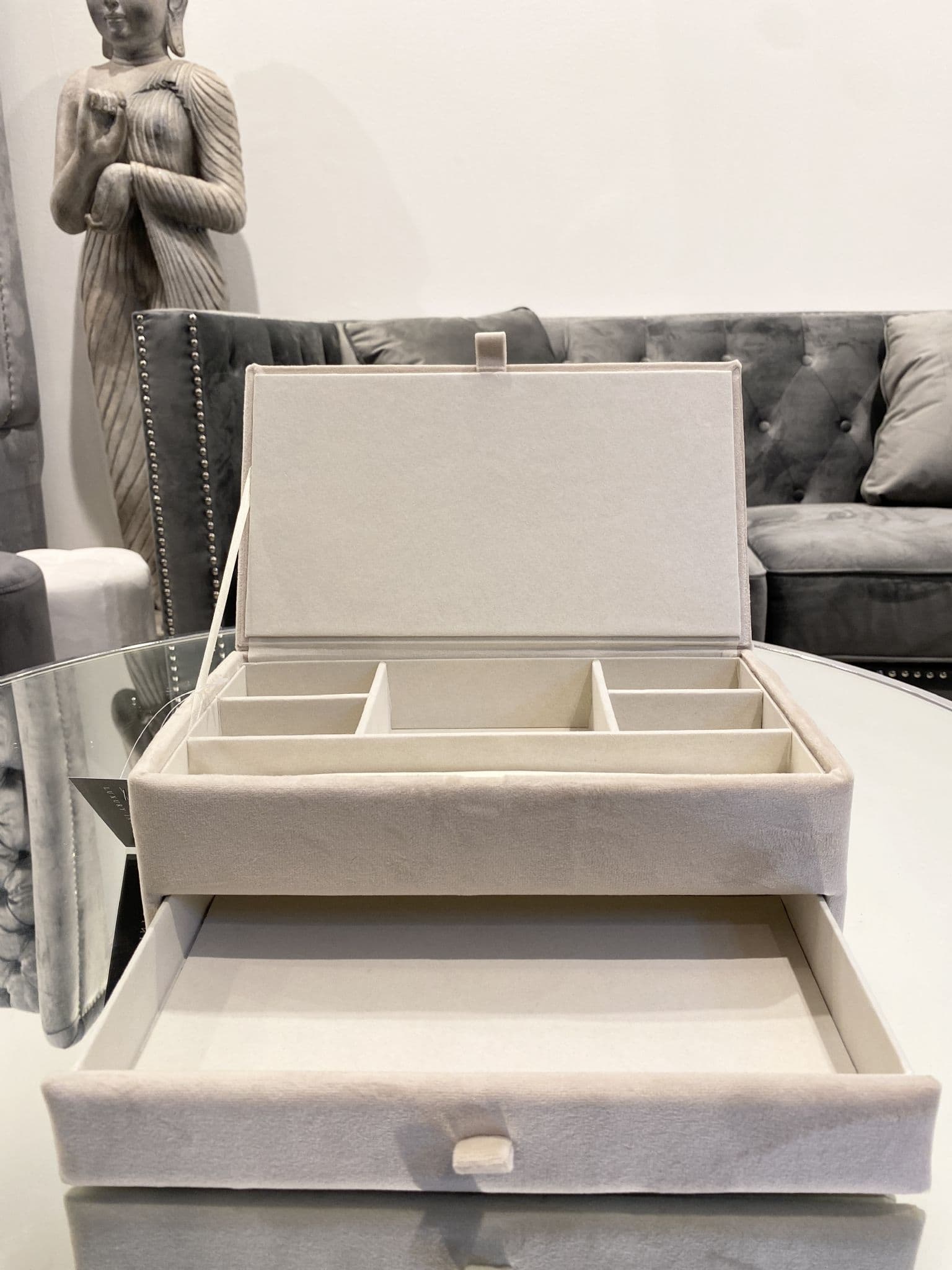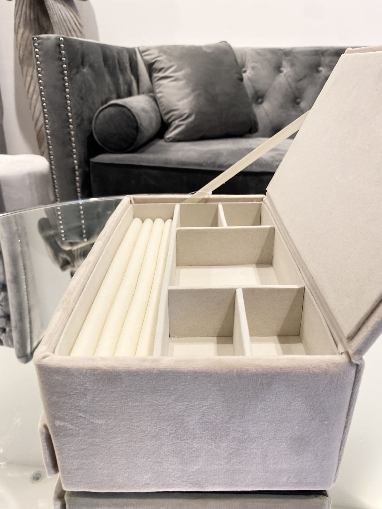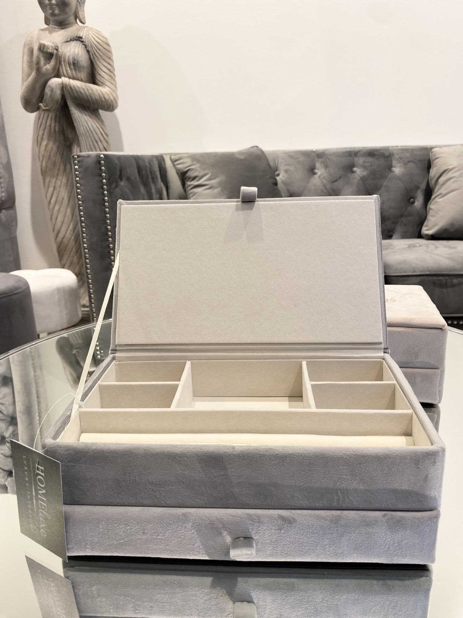 Store your items in style with this jewellery box. Acting as both decor and storage accessory. Featuring a beautiful smooth, velvet fabric, dual compartments and a chic golden text. An essential gift to those who take pride in luxury decor & or for those loving couples