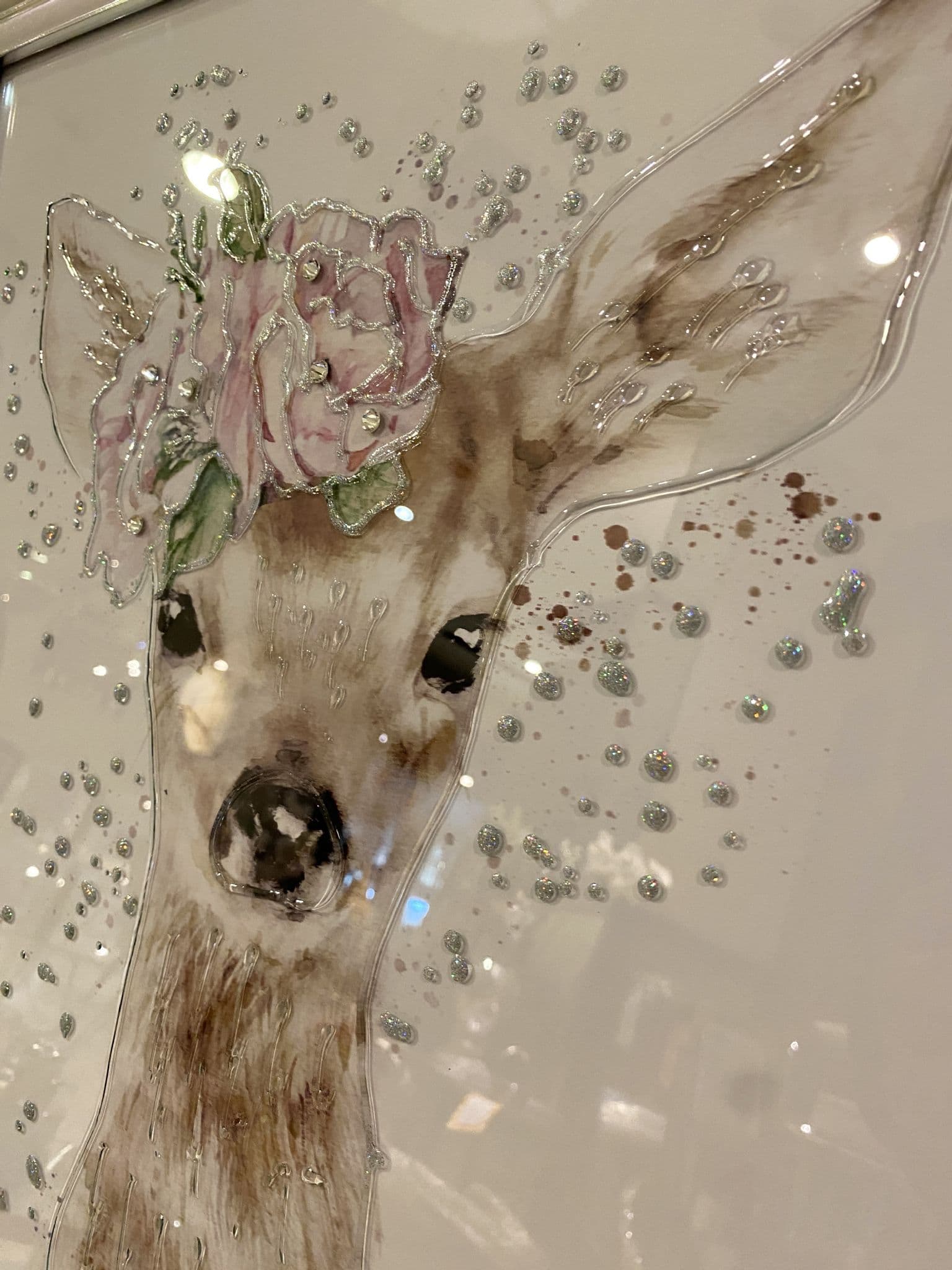 This picture features 'Deer Floral Watercolour', exhibiting a rich design with liquid details around the picture, creating a smart look for your home. Finished with a Chrome Step Frame.