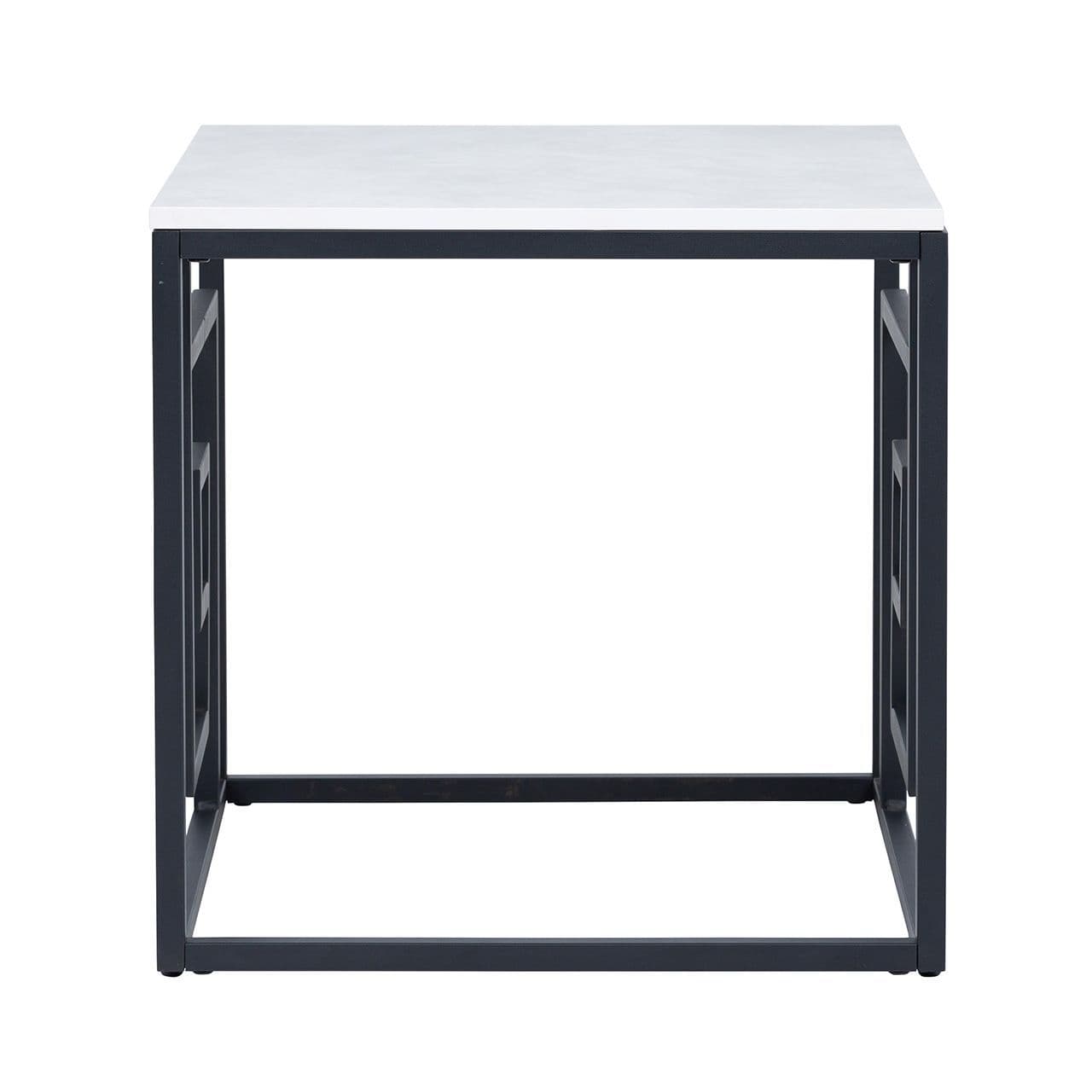 Add a touch of modern feel to any living area with the Devon end table. Featuring a sleek, black metal frame with a Grecian inspired framework along its sides and constructed with a grey wooden, faux concrete finish top