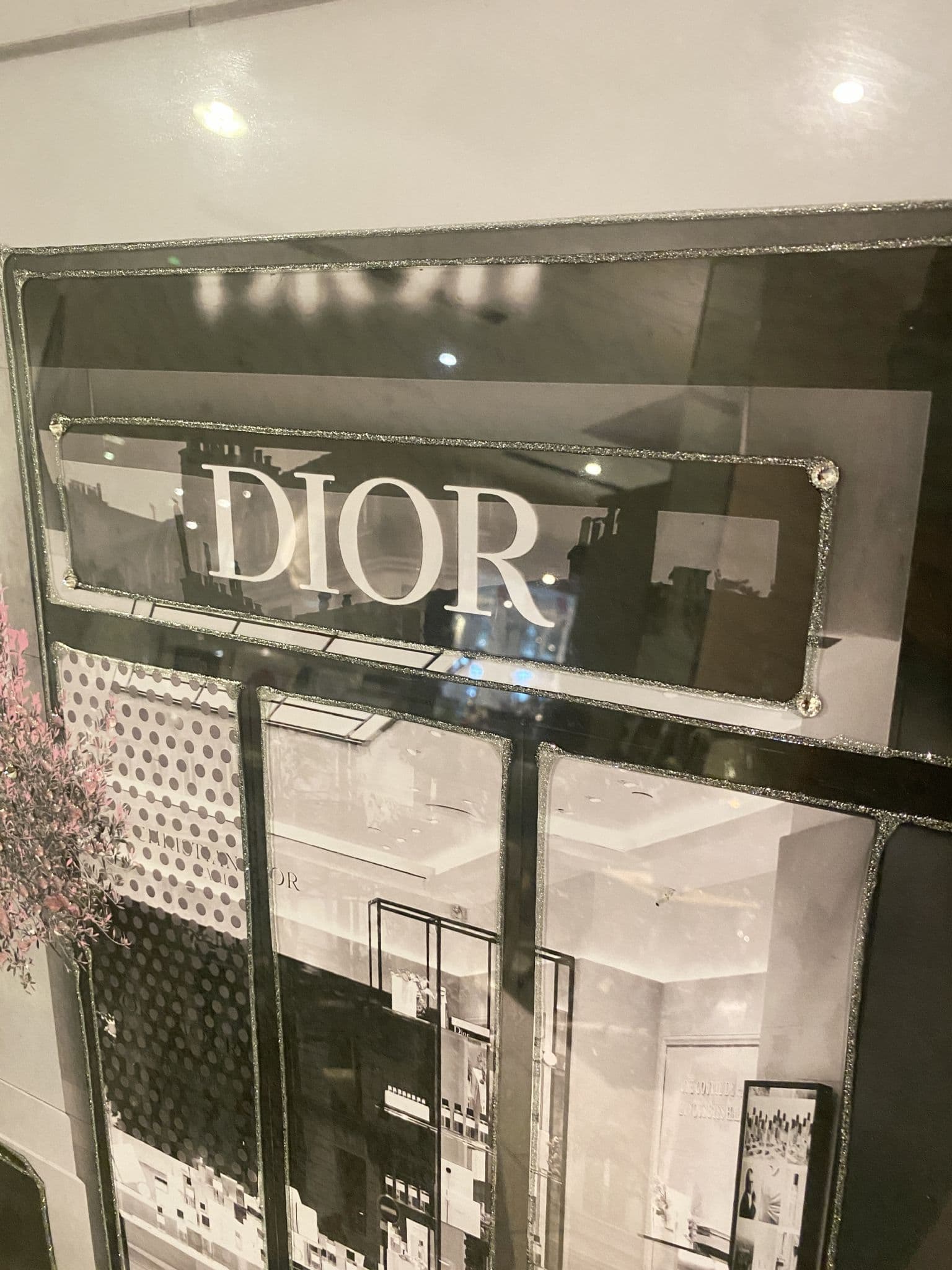 This picture features 'Dior Shop Front Blossom Tree', exhibiting a rich design with liquid details around the picture, creating a smart look for your home. Finished with a Mirror Frame.