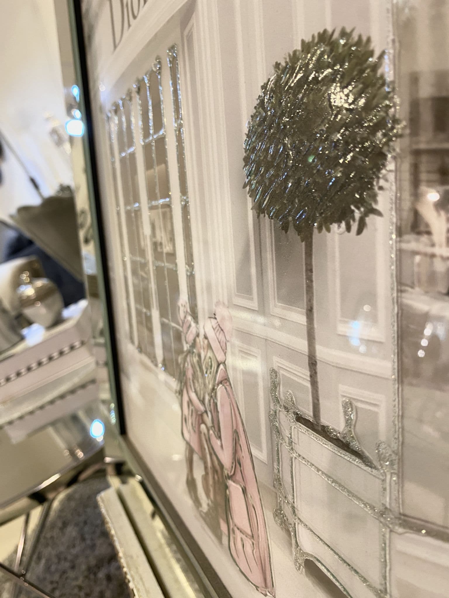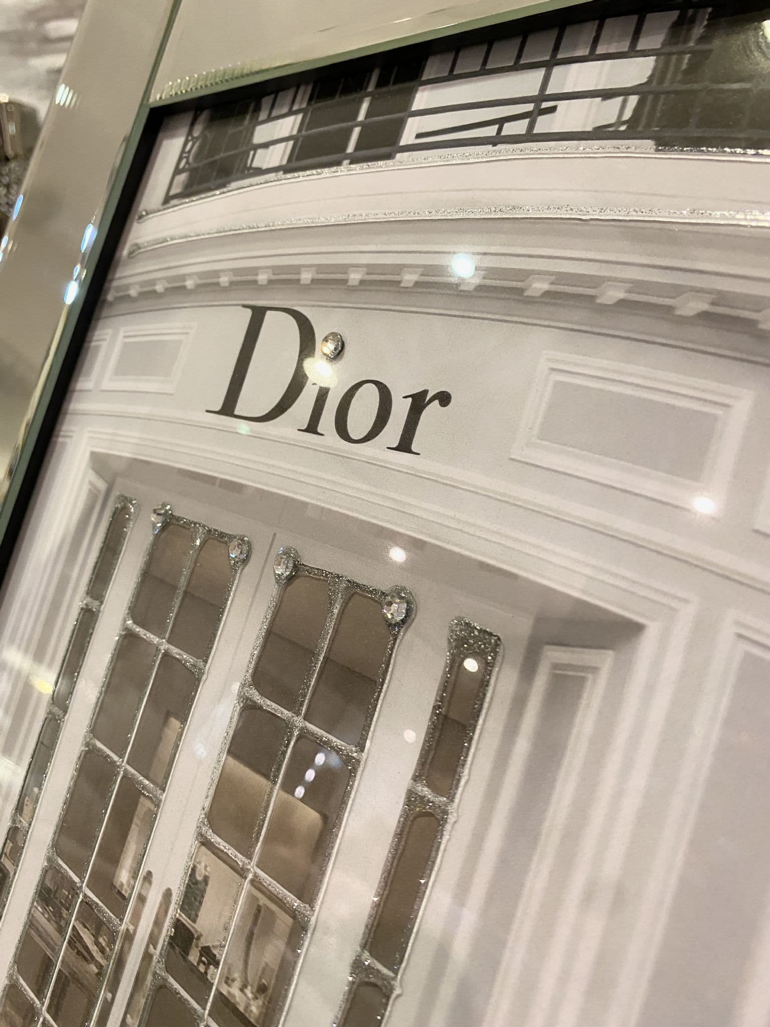 This picture features a 'Dior Shopfront Pink Winter' that exhibits a rich design with glitter details around the picture, creating a smart look for your home. Finished with a mirror frame.
