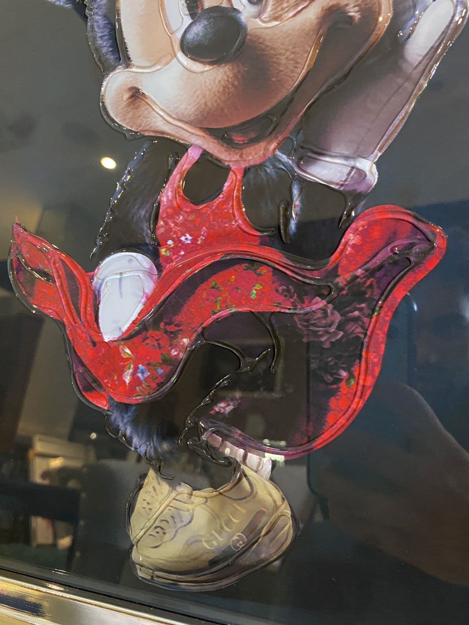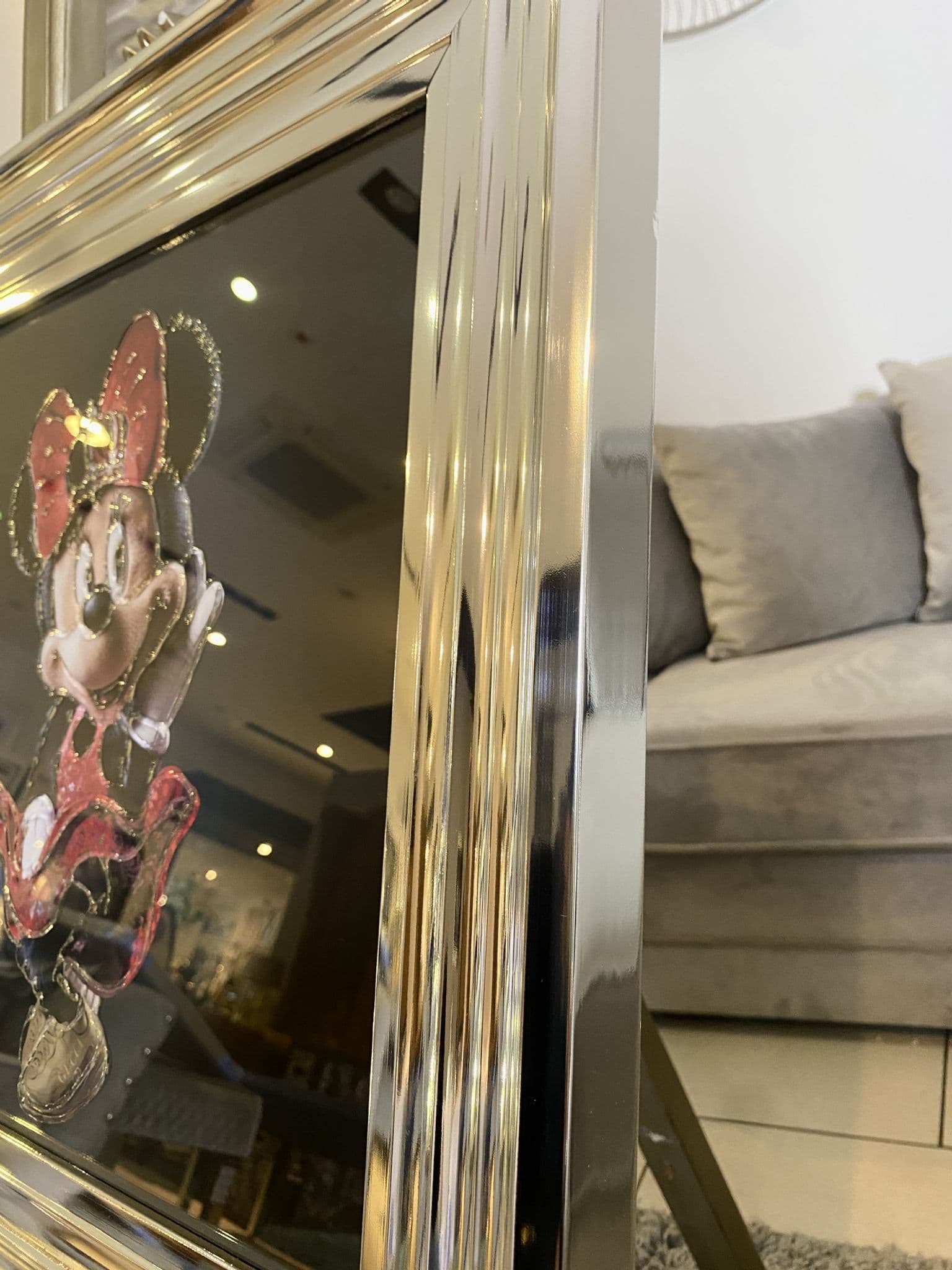 This picture features a 'Disney Minnie Mouse' that exhibits a rich design with glitter details around the picture, creating a smart look for your home. Finished with a chrome step frame.