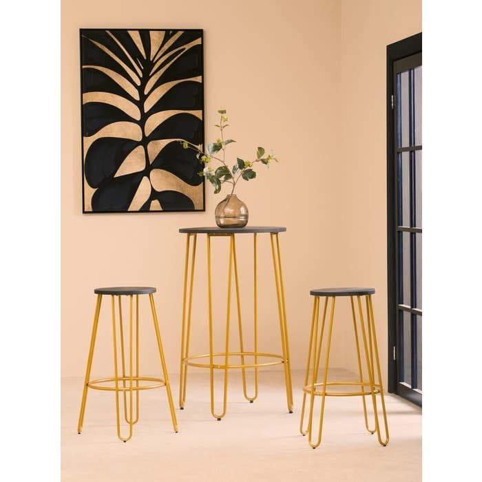 The District 3Pc Gold Finish Bar Table Stool Set is the perfect blend of functionality and modern design. Elevate your home bar or dining area with this stylish, durable set that brings an industrial yet warm touch to any space.