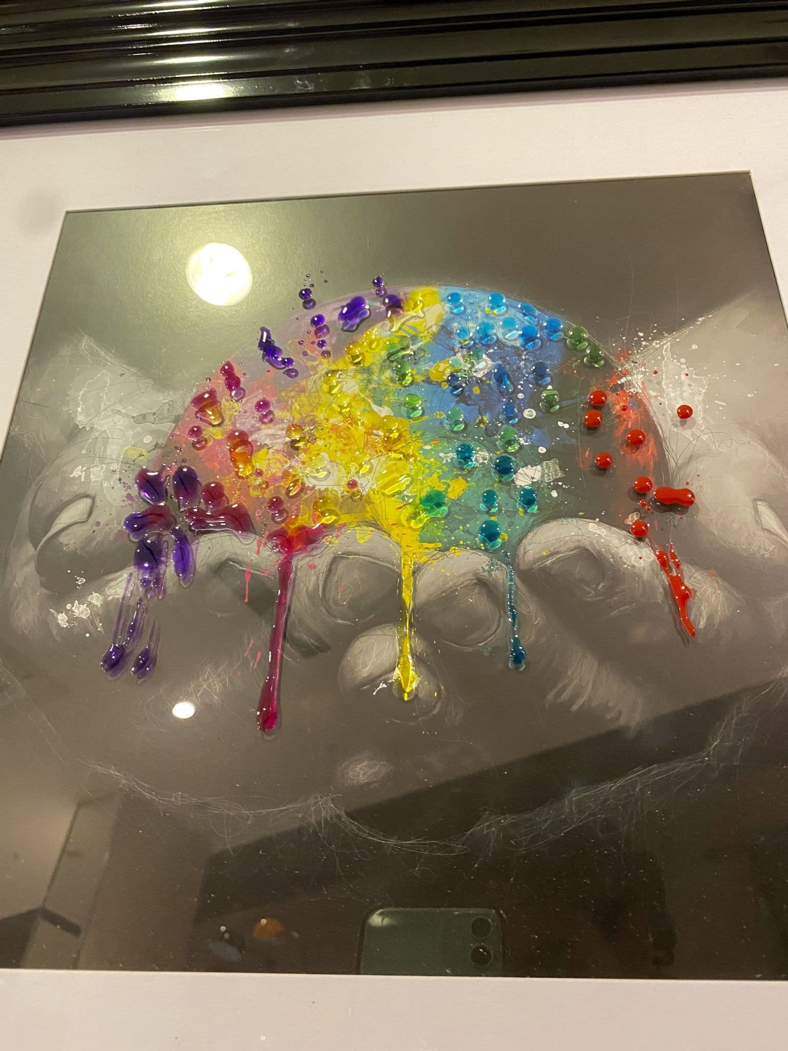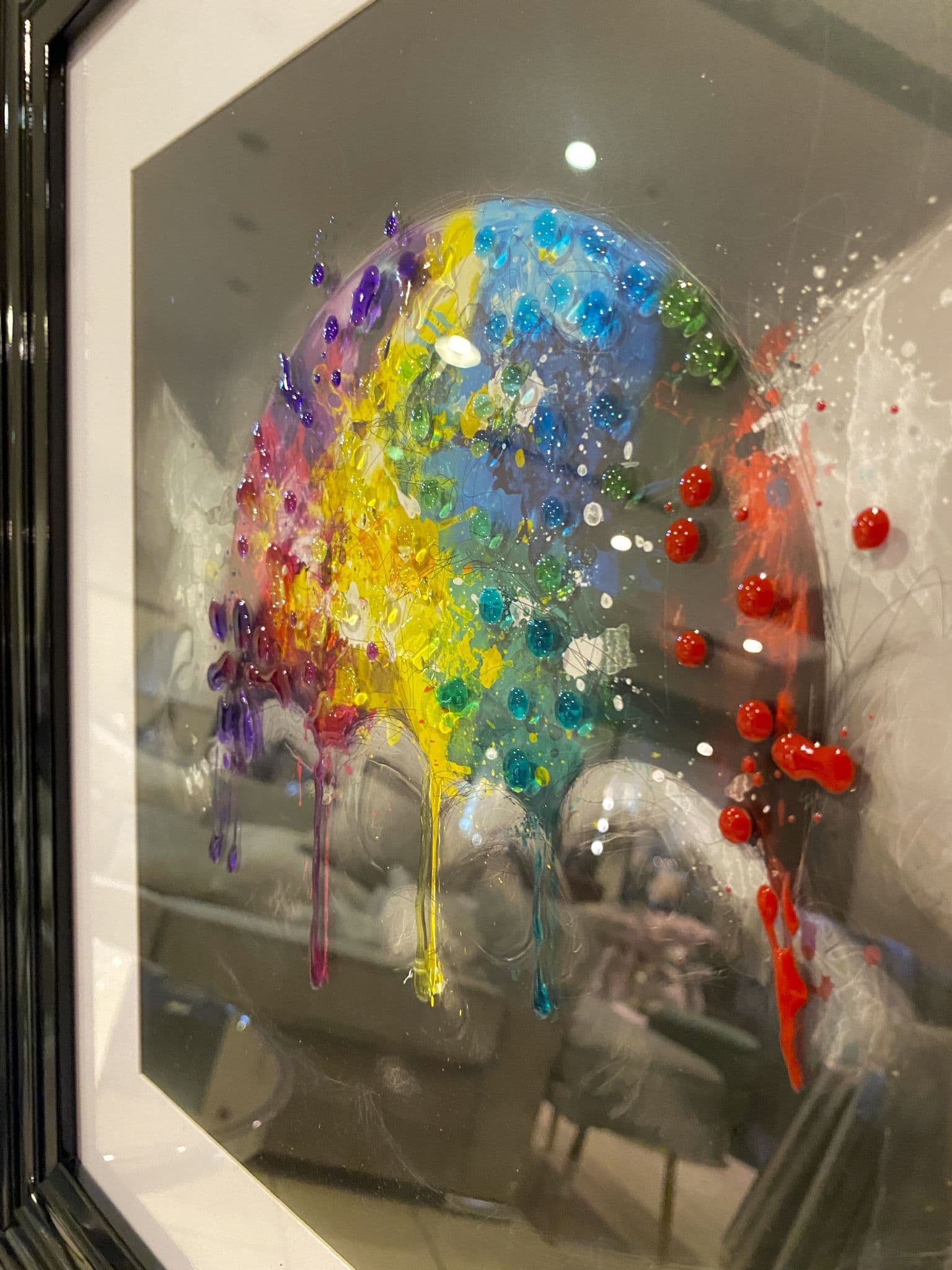 This picture features a 'Earth Hands Multicolour' that exhibits a rich design with glitter details around the picture, creating a smart look for your home. Finished with a black step frame.