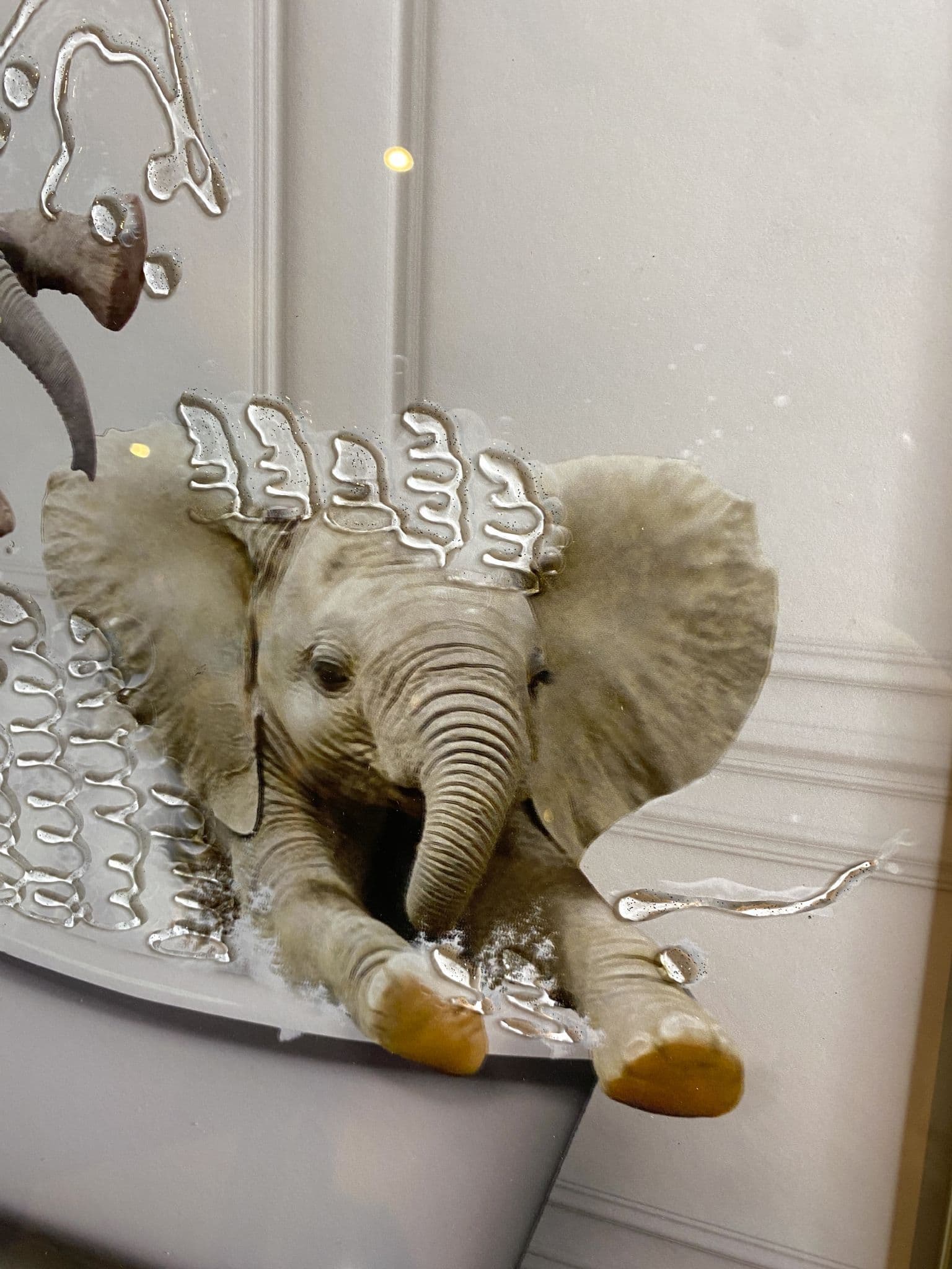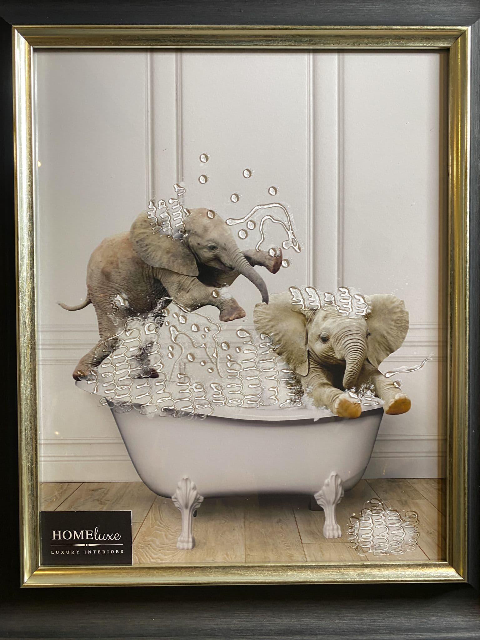 This picture features 'Elephants Bathtime', exhibiting a rich design with liquid details around the picture, creating a smart look for your home. Finished with a chic black frame.