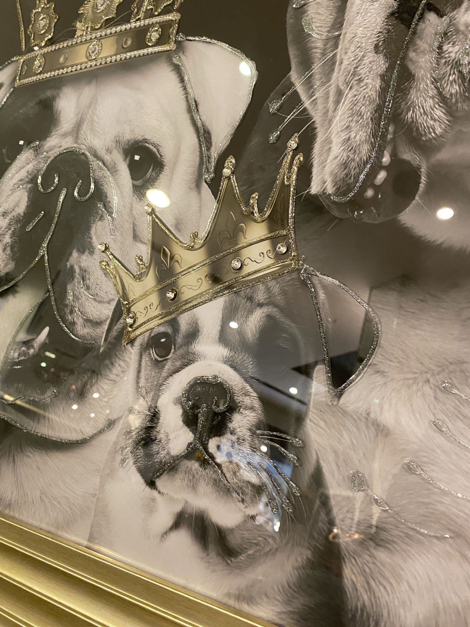 This picture features 'English Bulldog Family Crown', exhibiting a rich design with liquid details around the picture, creating a smart look for your home. Finished with a Champagne Step Frame.