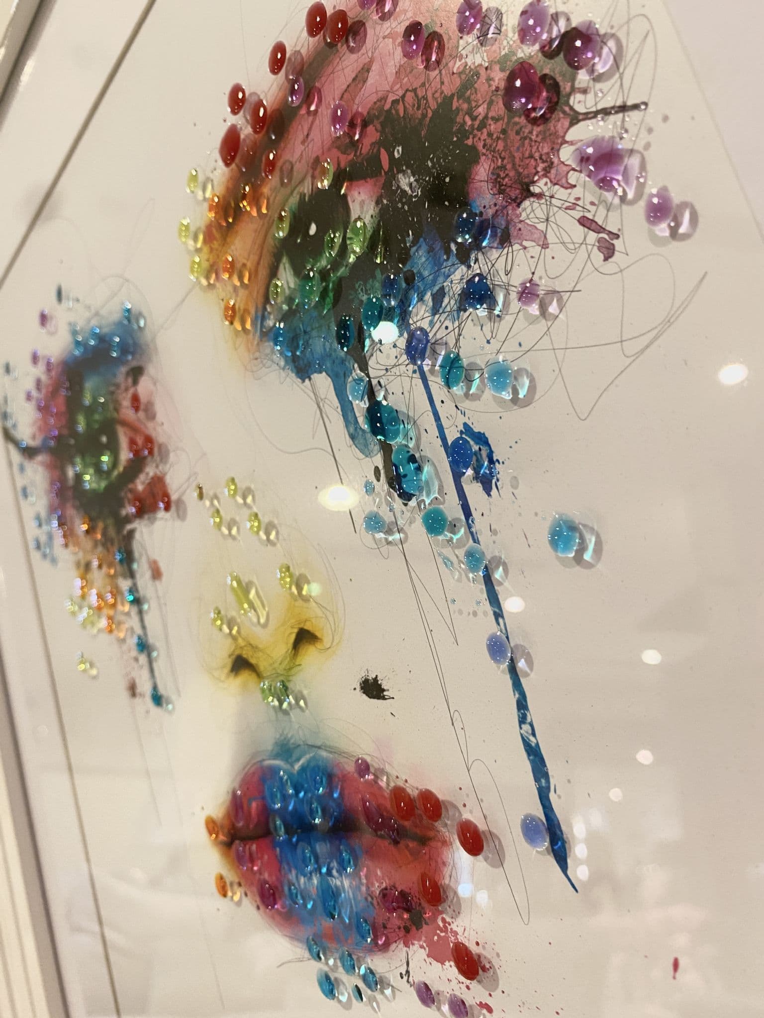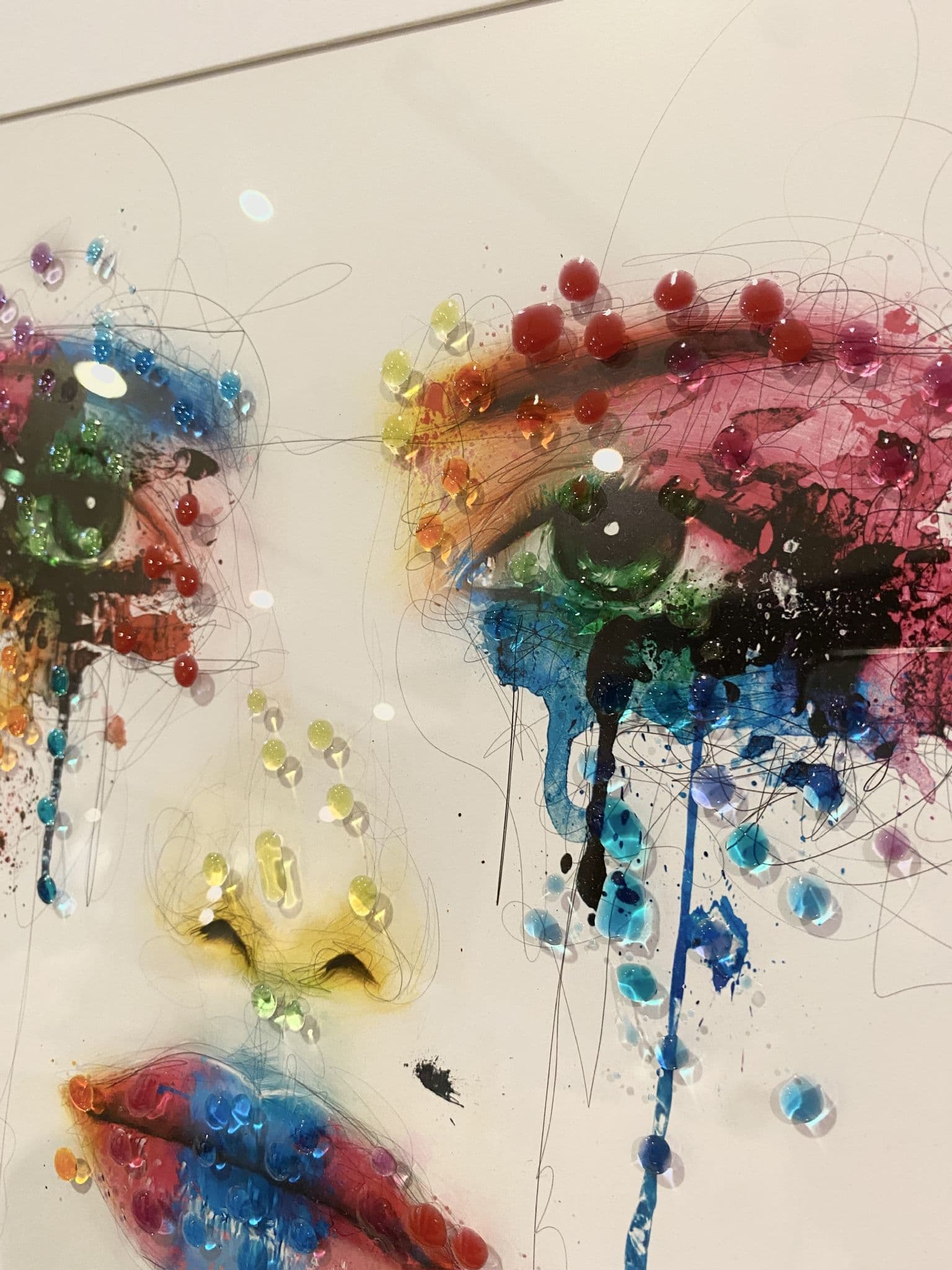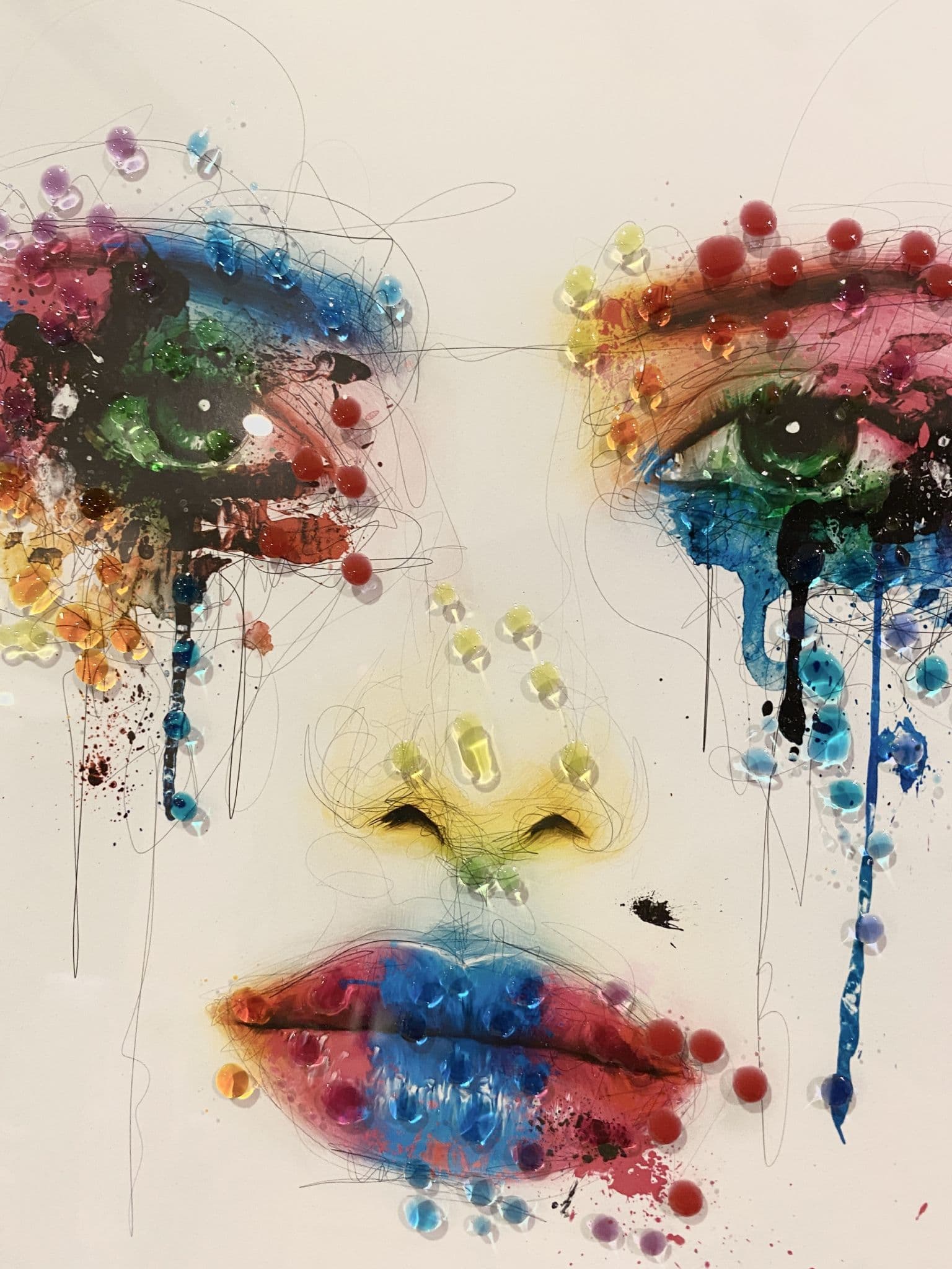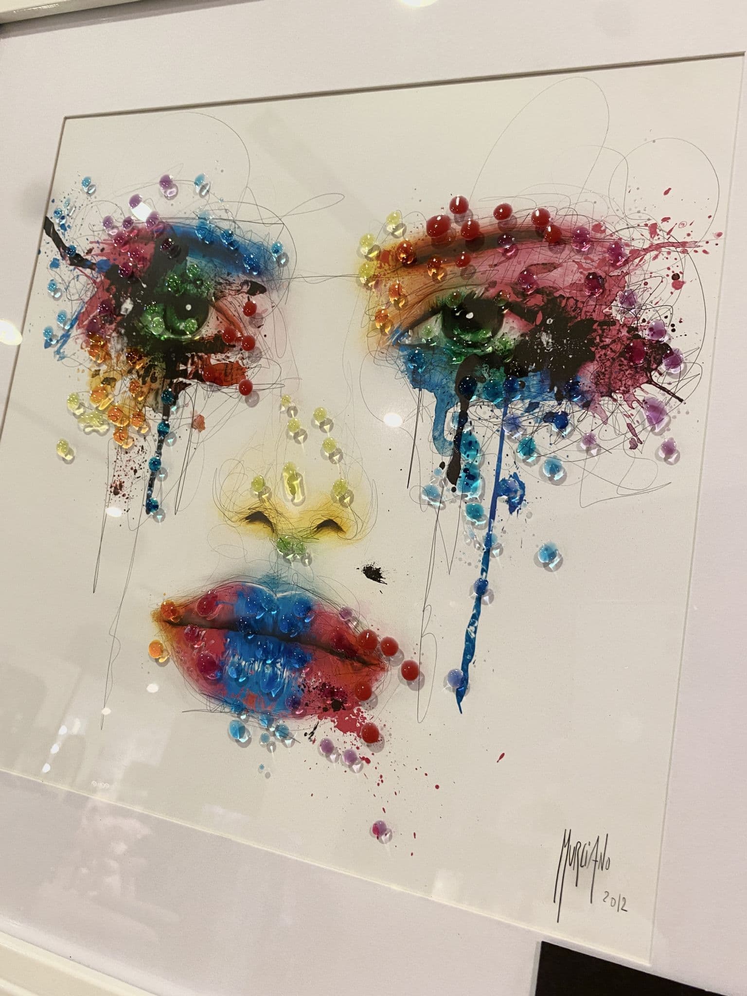 This picture features a 'Face Cry Multicolour' that exhibits a rich design with glitter details around the picture, creating a smart look for your home. Finished with a white step frame.