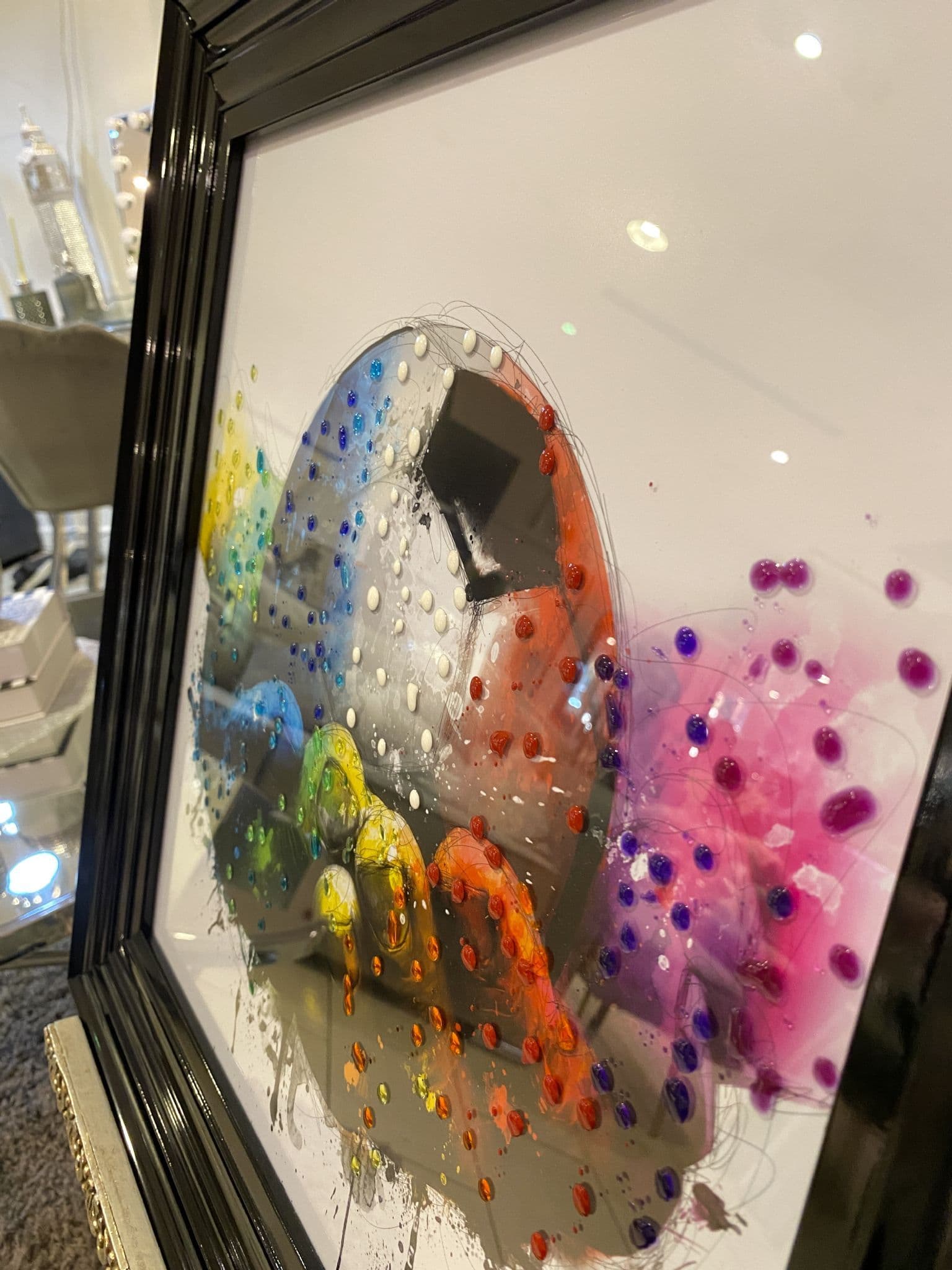 This picture features a 'Football Hands Multicolour' that exhibits a rich design with glitter details around the picture, creating a smart look for your home. Finished with a black step frame.