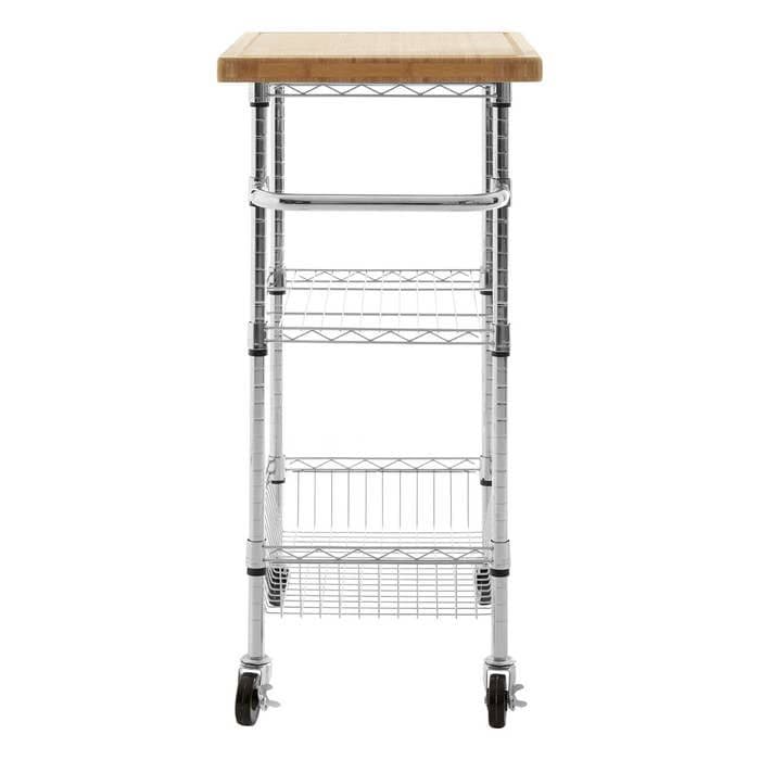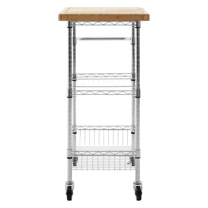 3-Tier Storage Maximizes space with two wireframe shelves and a bamboo top.