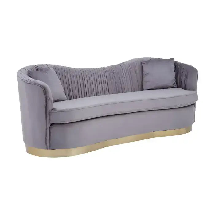 This Franza three-seater sofa is upholstered in a soft grey fabric with generous cushioning and two complementary cushions. The pleated detail on the back and a warm metallic strip on the lower front add to its opulent appeal