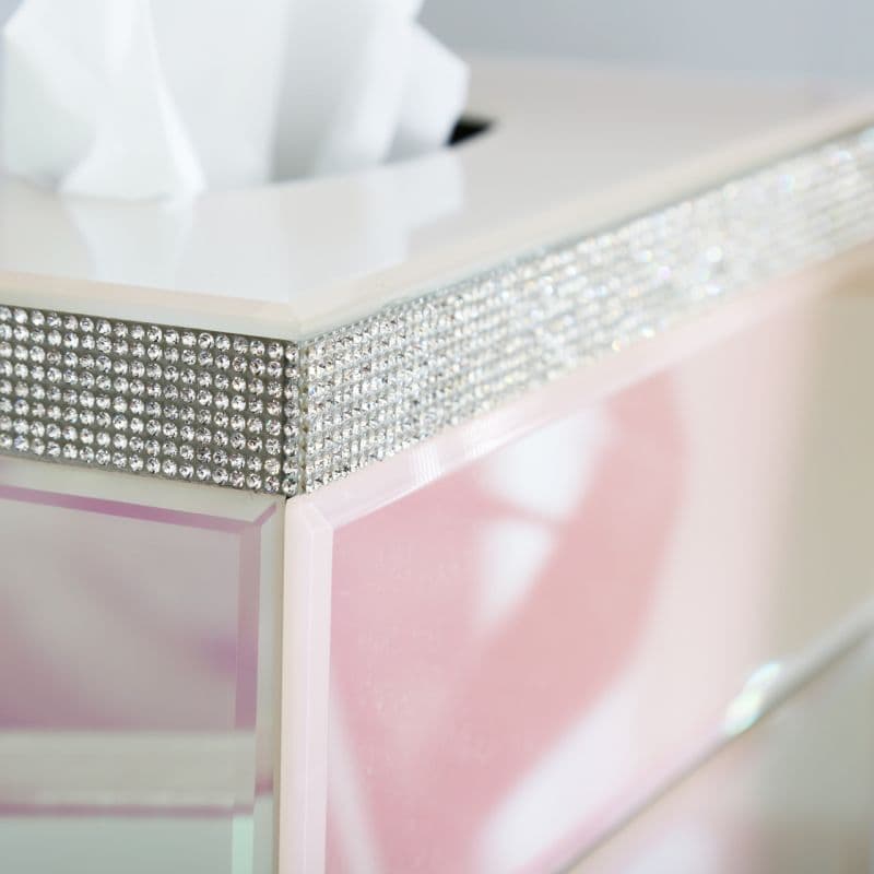 Store your tissues in style with this tissue box. Acting as both decor and storage accessory. Featuring a beautiful pink panelled construct, rhinestone crystal and jewel stripes, which offers a diamond encrusted effect. An essential gift to those who take pride in luxury decor