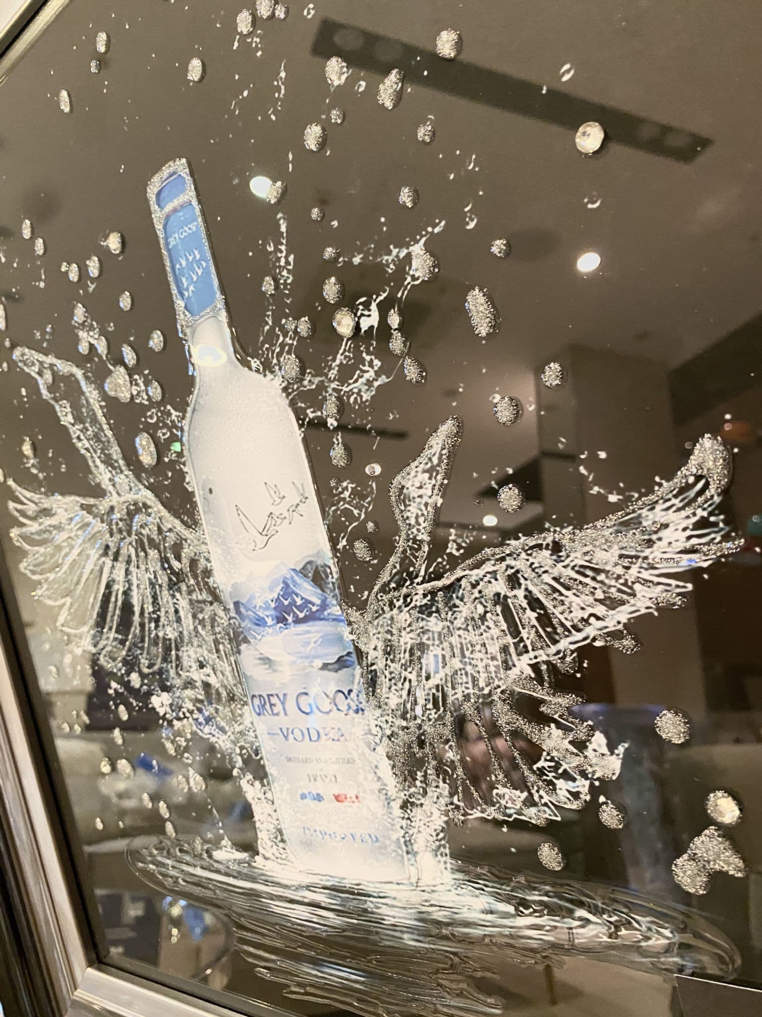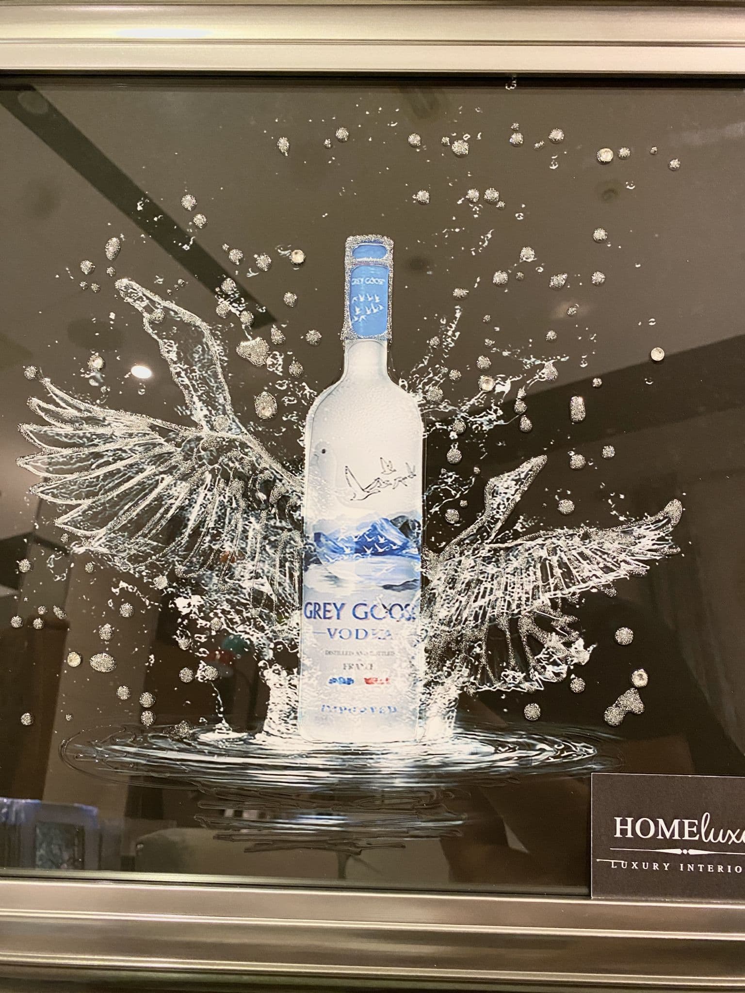 This picture features a 'Grey Goose Vodka Wings' that exhibits a rich design with glitter details around the picture, creating a smart look for your home. Finished with a black step frame.