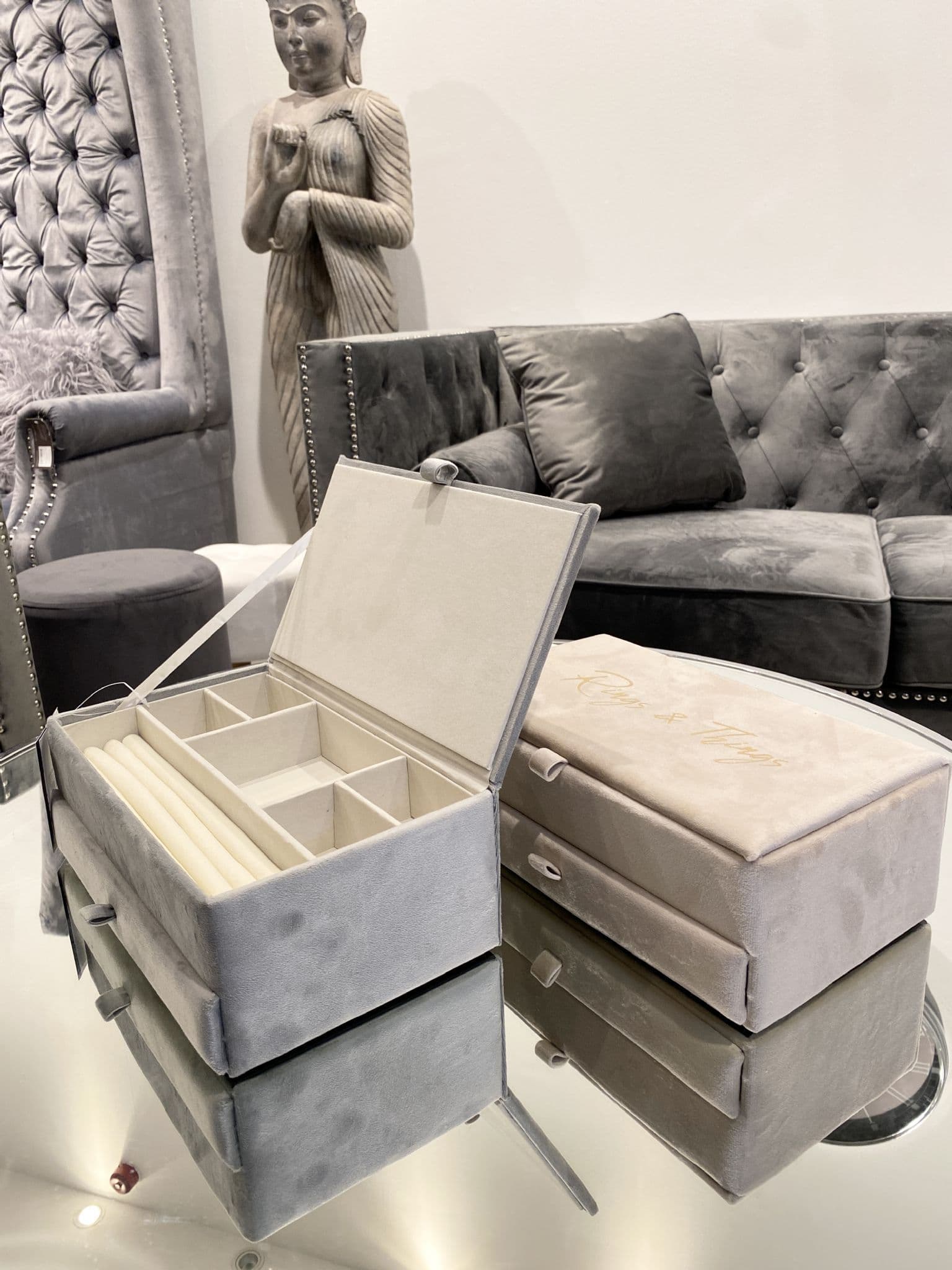 Store your items in style with this jewellery box. Acting as both decor and storage accessory. Featuring a beautiful smooth, velvet fabric, dual compartments and a chic golden text. An essential gift to those who take pride in luxury decor & or for those loving couples