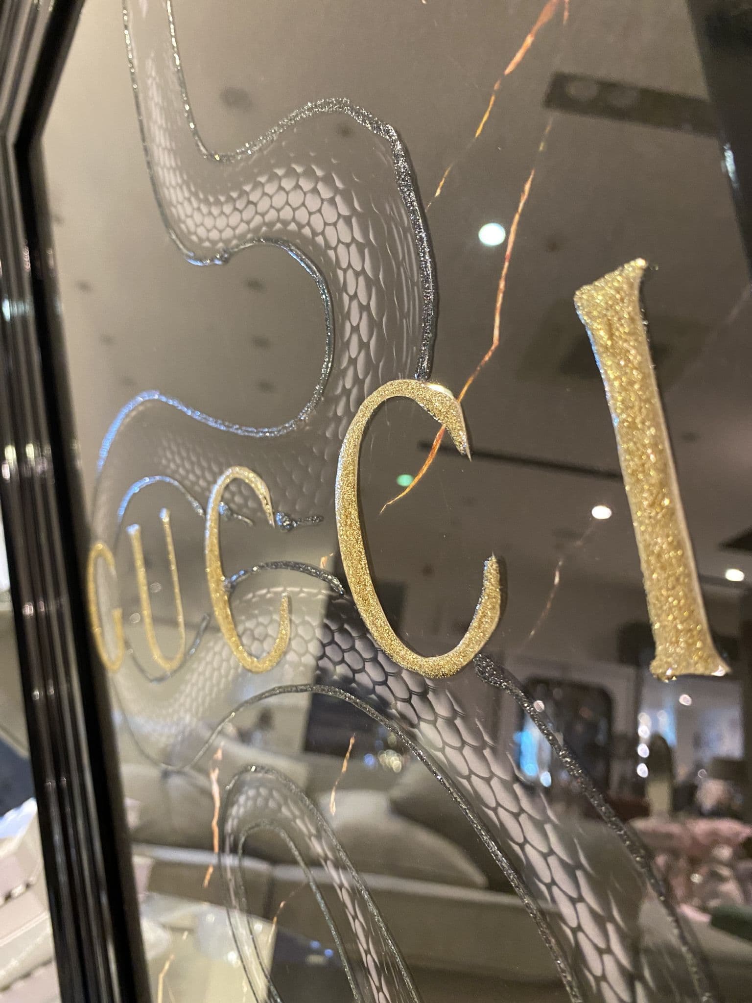 This picture features a chic 'Gucci Snake' that exhibits a rich design with glitter details around the picture, creating a smart look for your home. Finished with a black frame.