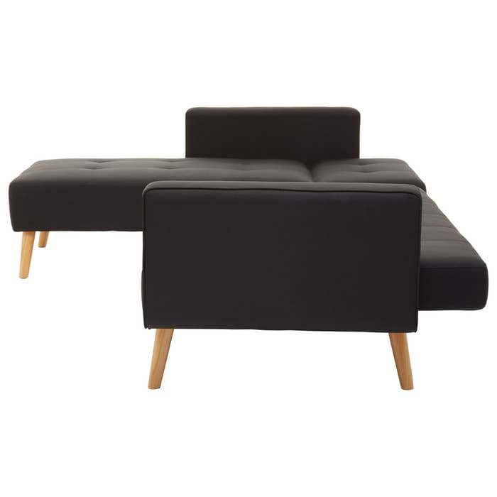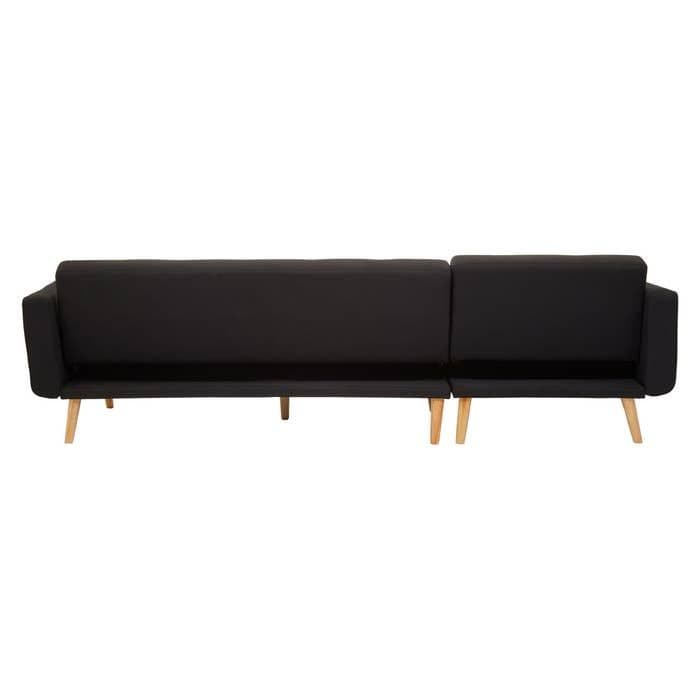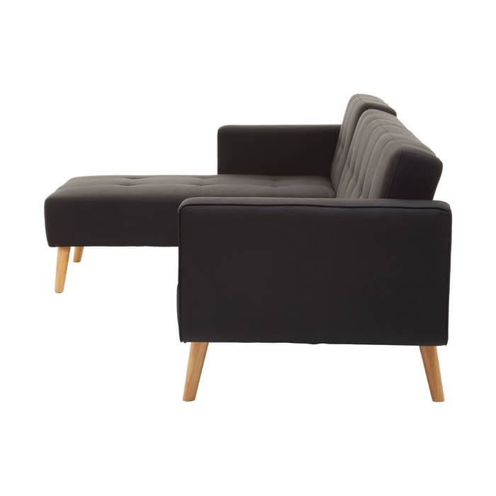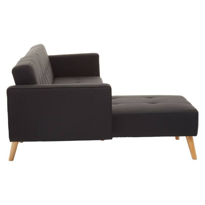 The Hansa Hagen Black Large Corner Sofa Bed from Home Luxe Interior features a sleek, modern design with clean-lined stitching and black linen upholstery. Inspired by Scandinavian minimalism, it has sturdy oak wood legs and button-tufted detailing for a stylish touch. Well-cushioned and practical, its perfect for contemporary and Nordic-style interiors.