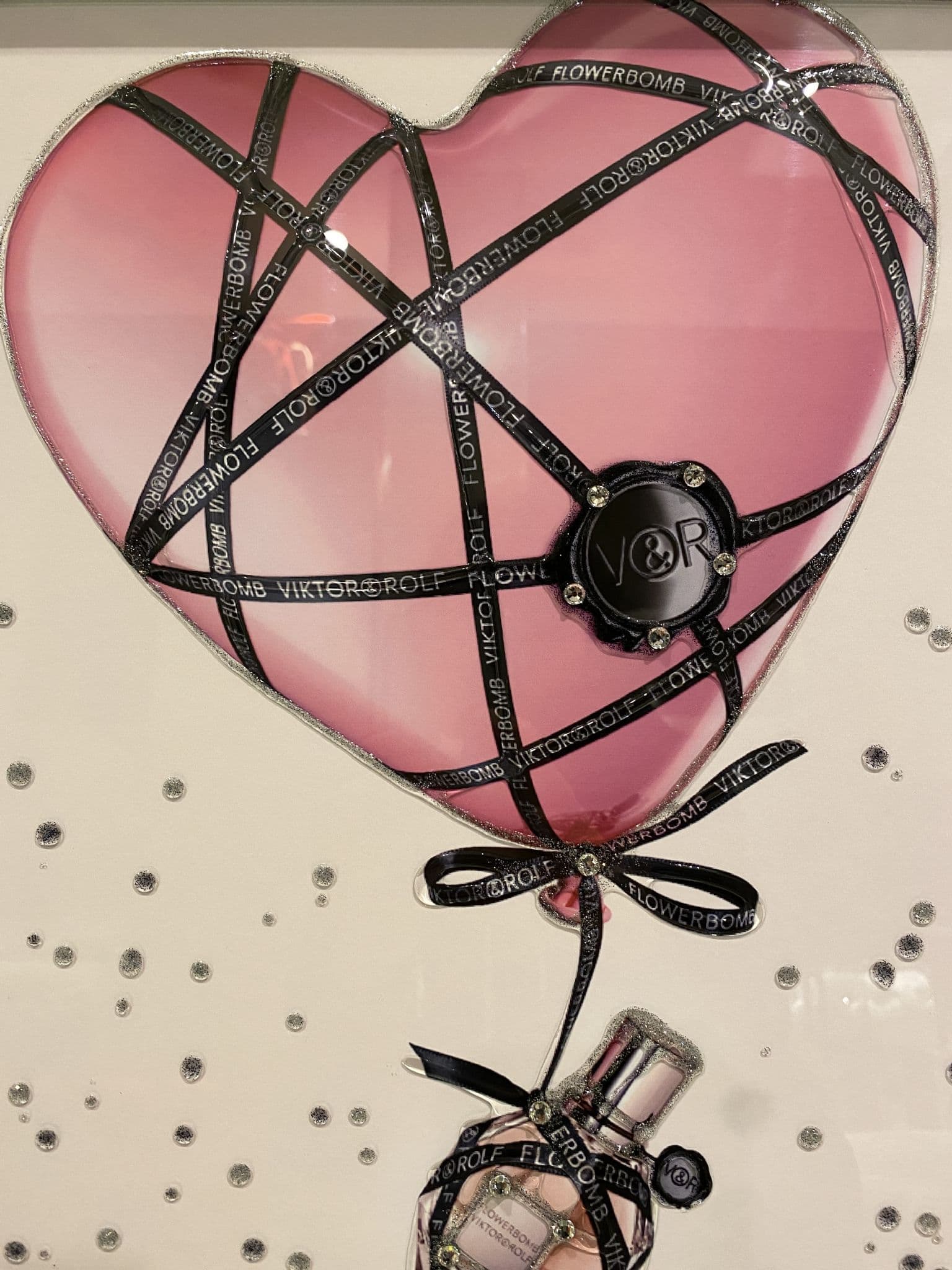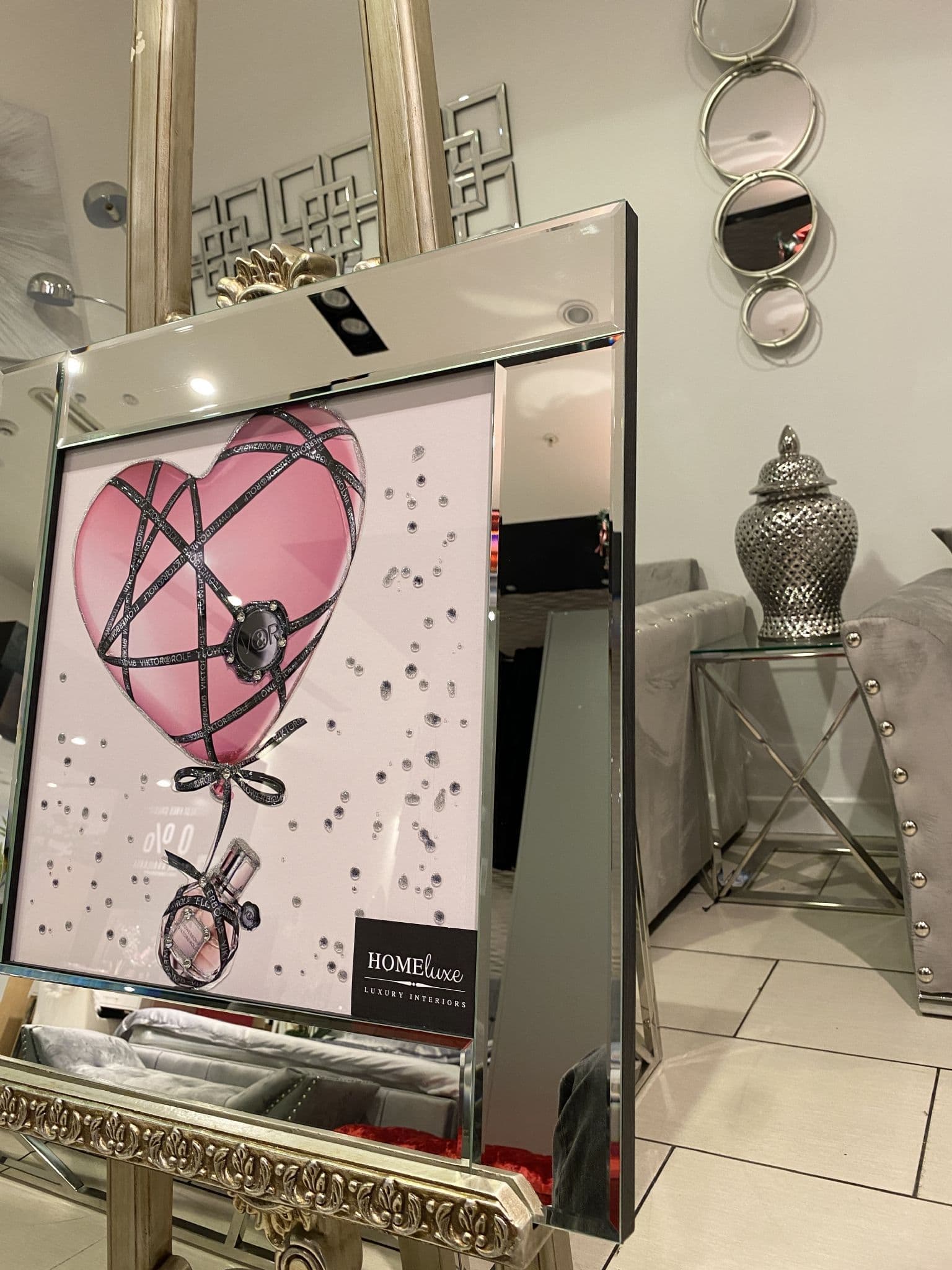 This picture is with a 'Heart Balloon Pink Perfume' which exhibits a classy vibe with glitter details around the picture creating a smart look for your home. Finished with a mirror frame.
