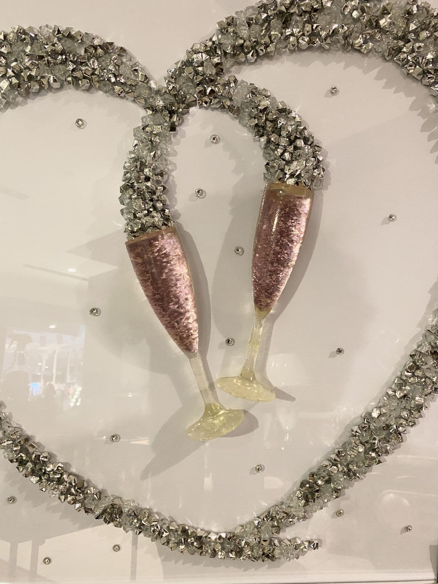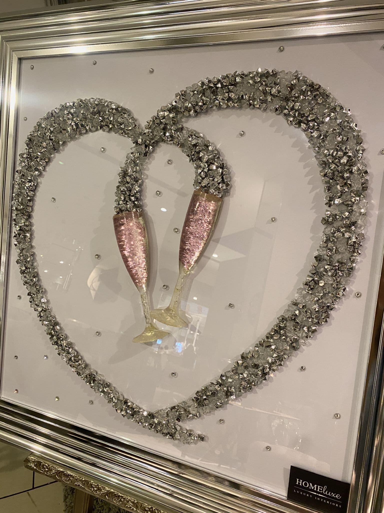 This picture features 'Hearts Diamond With Glasses', exhibiting a rich design with liquid details around the picture, creating a smart look for your home. Finished with a Chrome Step Frame.