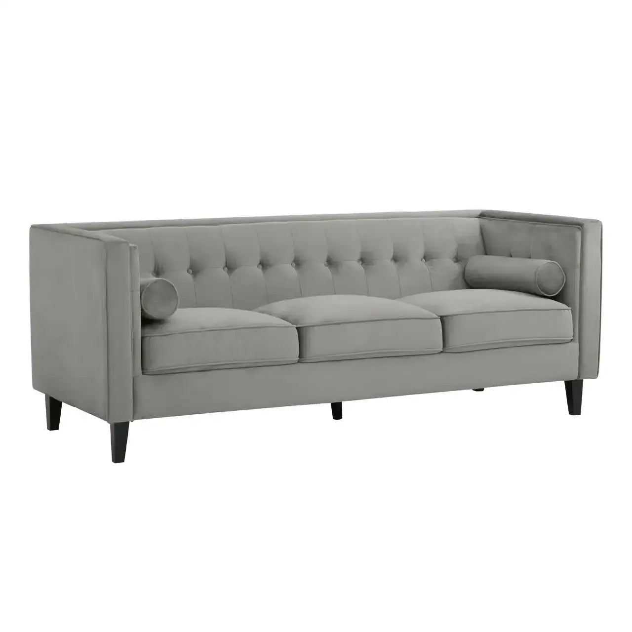 Introduce sophisticated comfort into your living space with the Helia 3 Seat Grey Velvet Sofa, a perfect blend of classic charm and contemporary design. Upholstered in sumptuous grey velvet, this sofa boasts dense foam padding for superior comfort. The button-tufted back adds a touch of elegance, while the bolster pillows provide additional support and style. The slanted oak legs in a sleek black finish offer stability, ensuring a strong and durable frame.