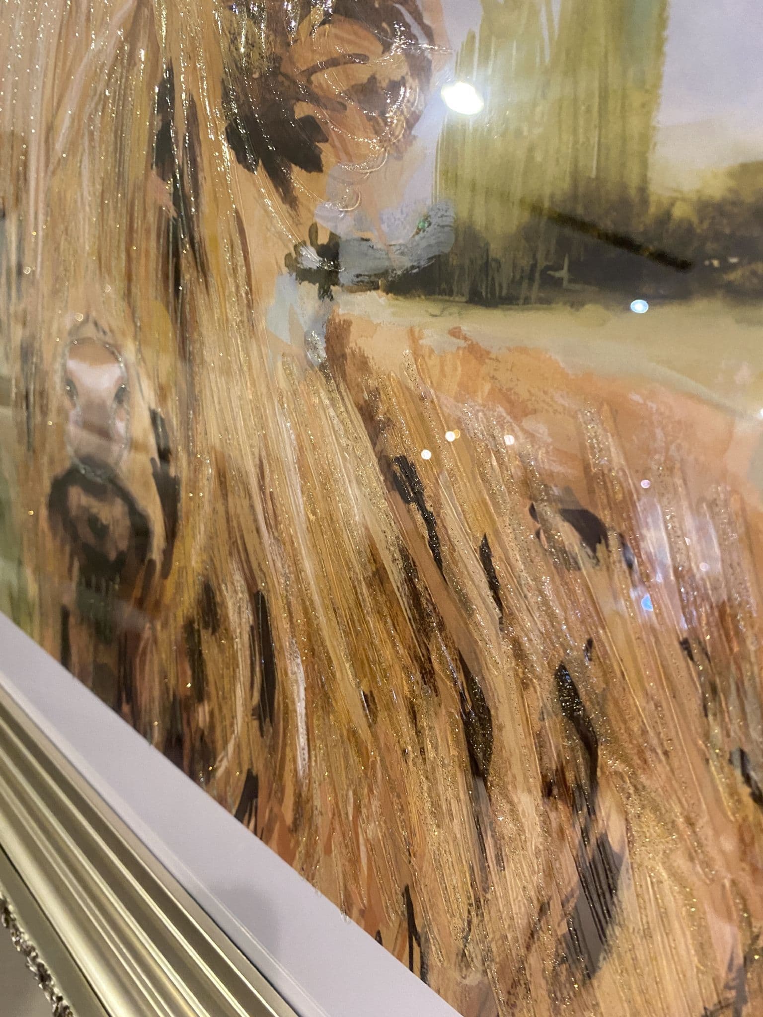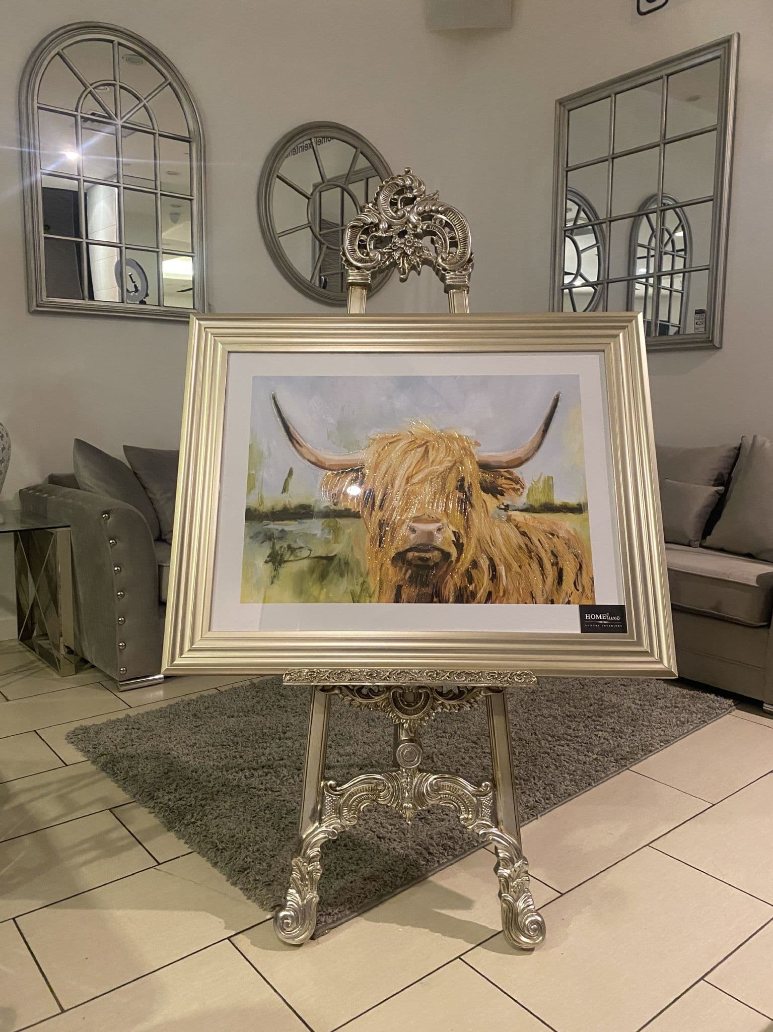 This picture features 'Highlander Wall Art', exhibiting a rich design with liquid details around the picture, creating a smart look for your home. Finished with a Champagne Step Frame.